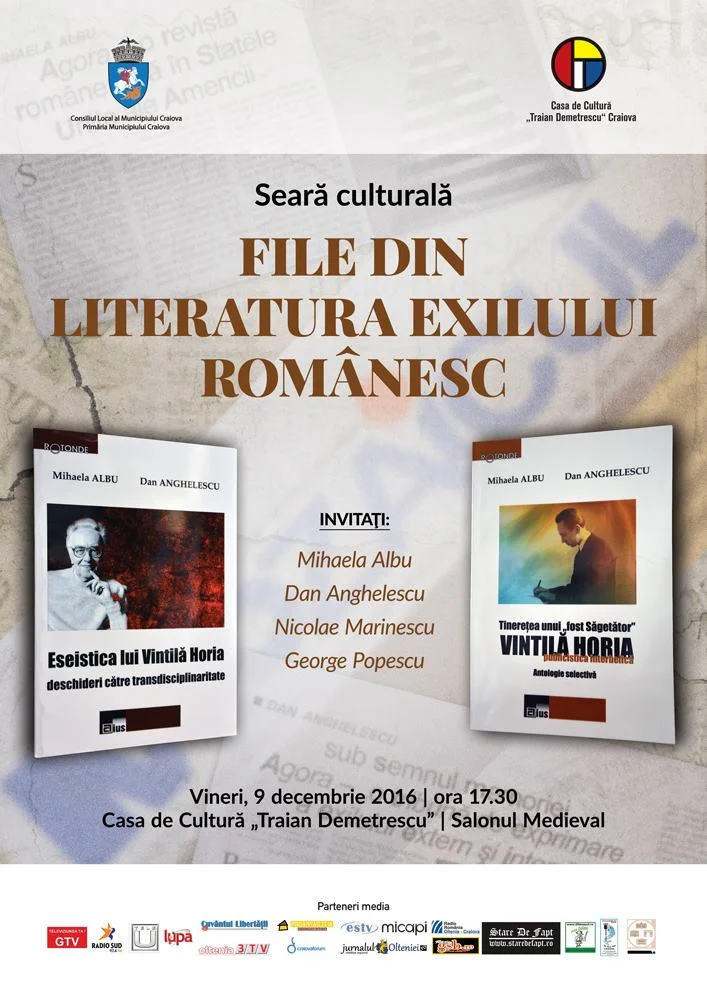 Casa de Cultură „Traian Demetrescu” organizează vineri, 9 decembrie 2016, ora 17:30, în Salonul Medieval, o seară culturală intitulată „File din literatura exilului românesc”. Participă cercetători care au studiat fenomenul cultural al exilului românesc, scriitorii Mihaela Albu și Dan Anghelescu, împreună cu directorul revistei Mozaicul, Nicolae Marinescu, care și-a asumat promovarea exilului românesc. Invitat: scriitorul George Popescu. În cadrul întâlnirii, vor fi prezentate două cărți dedicate eseisticii lui Vintilă Horia, apărute la editura Aius (autori – Mihaela Albu și Dan Anghelescu), precum și numărul 12 al revistei Mozaicul, care cuprinde un dosar, coordonat de Mihaela Albu, dedicat unor reviste românești din exil. Intrarea publicului este liberă.