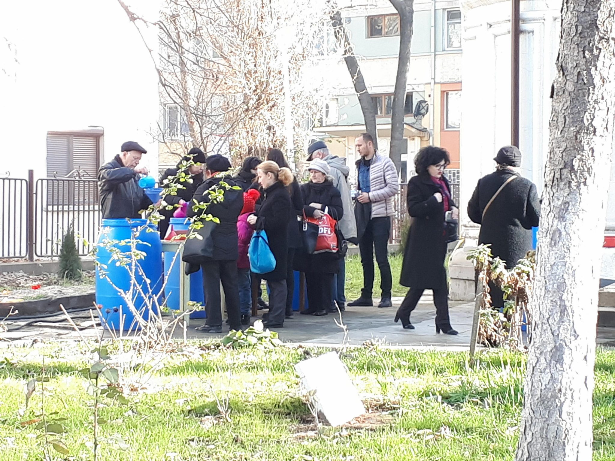 Și curtea bisericii Madona Dudu a fost plină de credincioși care au venit să ia apă sfințită.