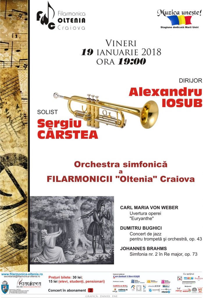 Orchestra Simfonică a Filarmonicii „Oltenia” Craiova, dirijată de maestrul Alexandru Iosub, prezintă în primă audiţie vineri, 19 ianuarie 2018, ora 19:00, un concert de jazz în interpretarea trompetistului Sergiu Cârstea.