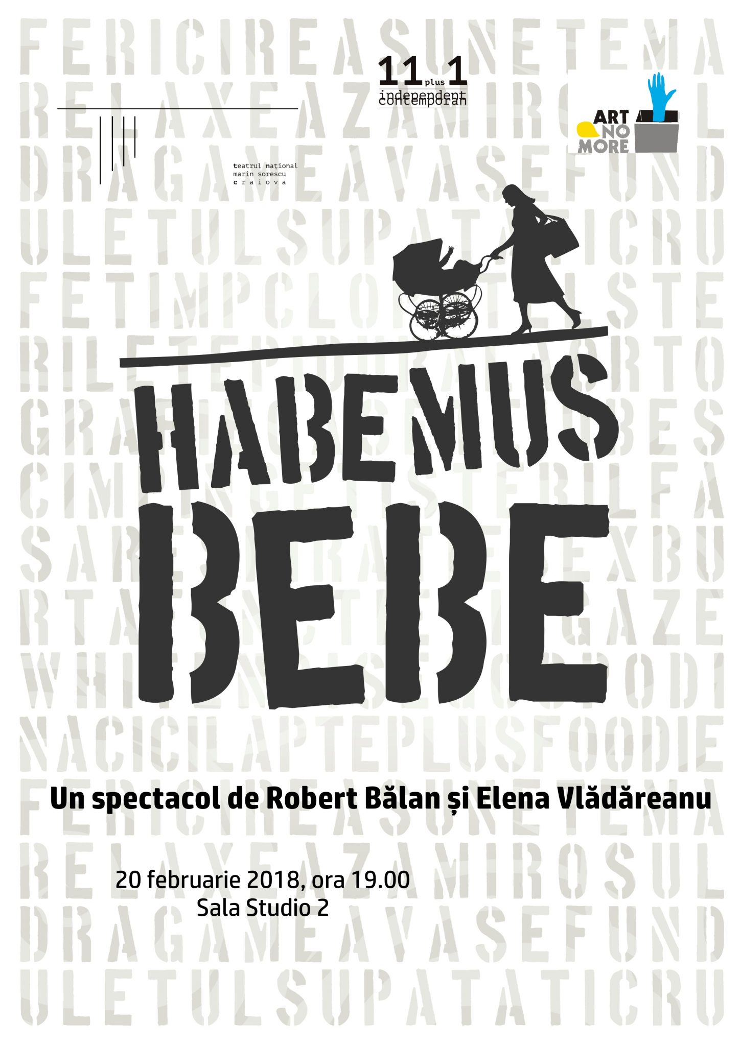 Pe 20 februarie- HABEMUS BEBE de Elena Vlădăreanu, regia Robert Bălan, un proiect ART NO MORE cu sprijinul WASP – Working Art Space and Production– este un performance despre experienţa maternităţii, despre condiţia femeii-artist, despre confuzie şi crize, despre identitate şi panică, despre limite, corp şi… nutriţie.
