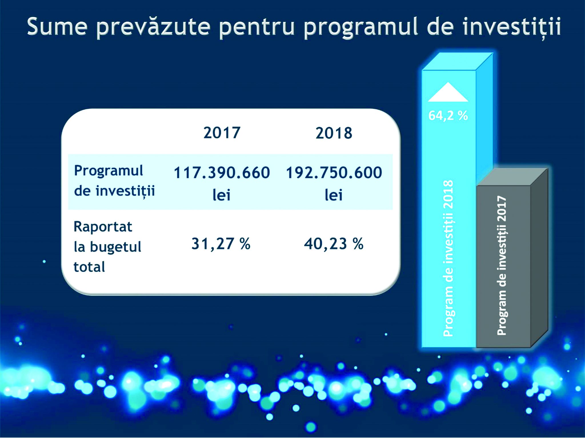Din cei peste 190 milioane de lei prevăzuţi pentru programul de investiţii, peste 61 milioane lei merg către capitolul Transporturi, pentru Protecţia Mediului sunt prevăzuţi peste 50 milioane lei, iar pentru Sănătate peste 30 milioane lei, iar pentru Cultură şi Recreere, peste 30 milioane lei.