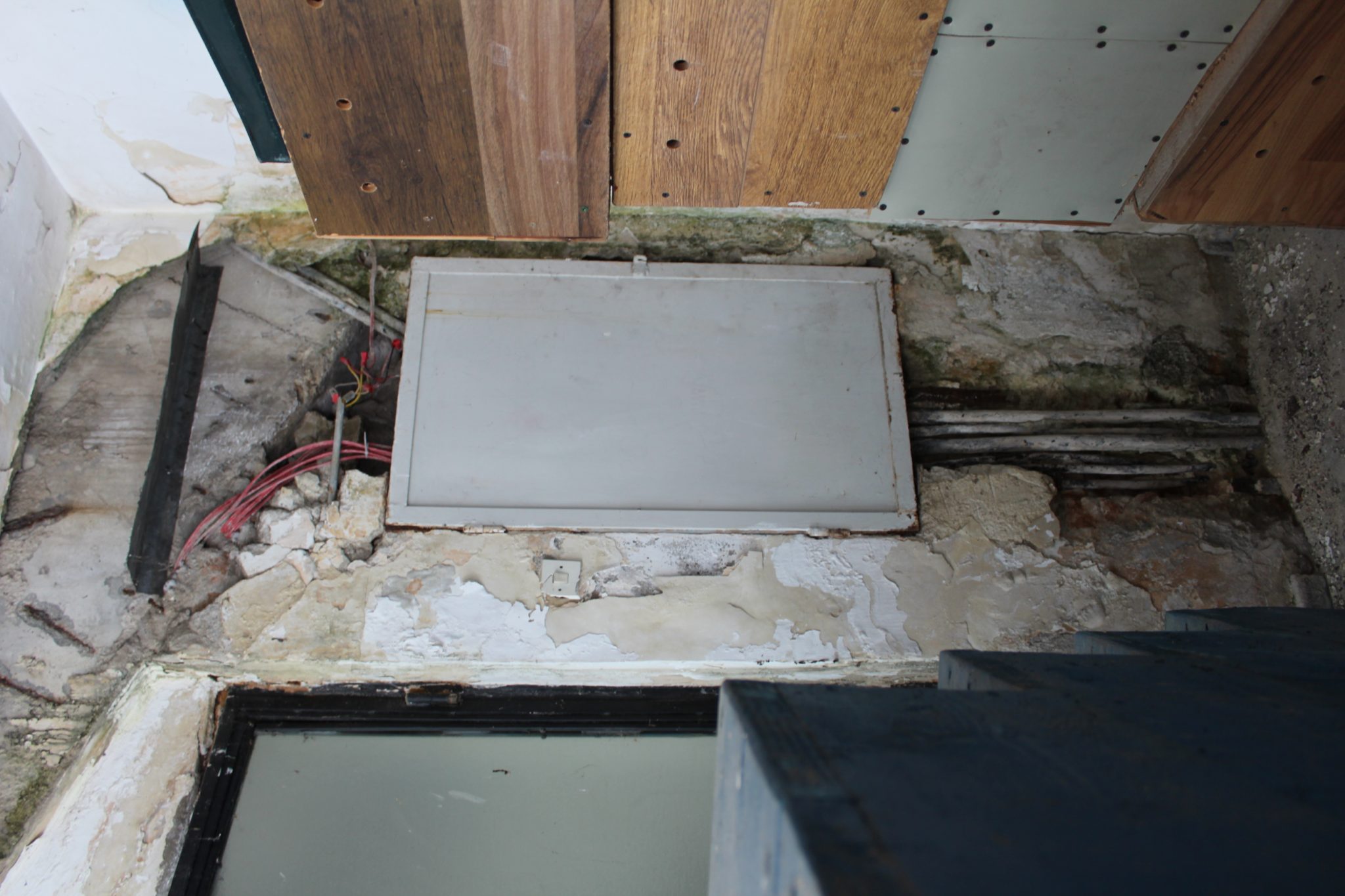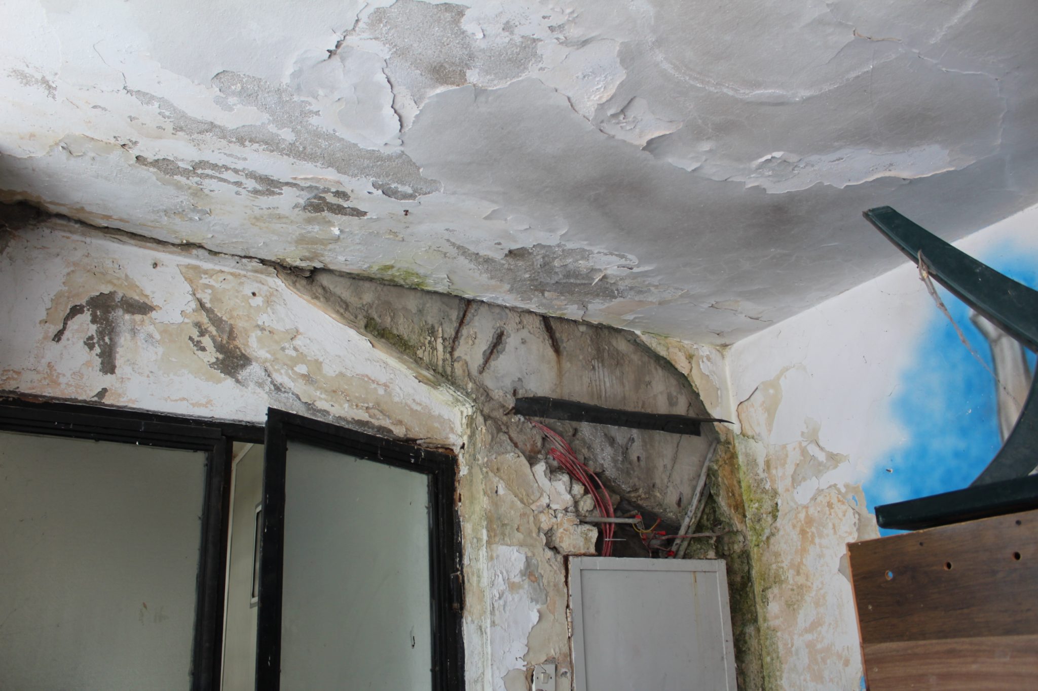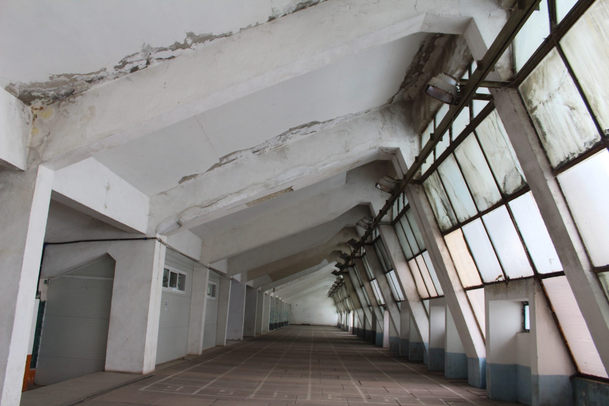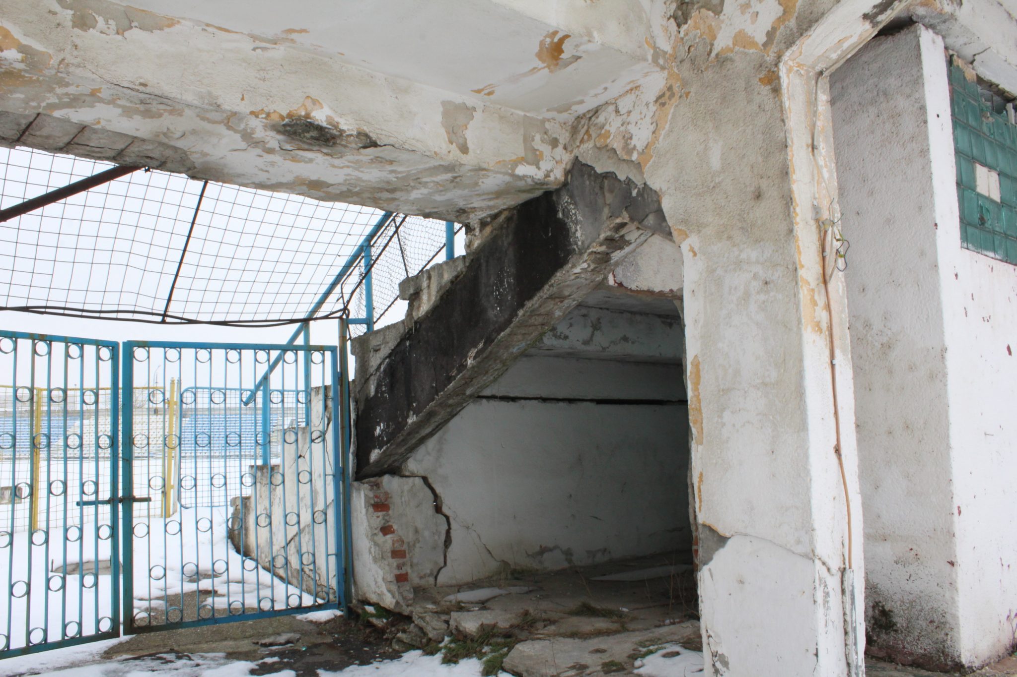 În interior, la vestiare şi în sala de sport de sub tribuna oficială, lucrurile sunt şi mai grave. Coloanele de susţinere îşi arată deja armătura de fier, iar tencuiala stă să cadă. Duşurile sunt doar cu numele, iar mirosul este greu suportabil. Geamurile lipite cu bandă izolieră şi tabloul electric peste care curge apă completează imaginea dezolantă.