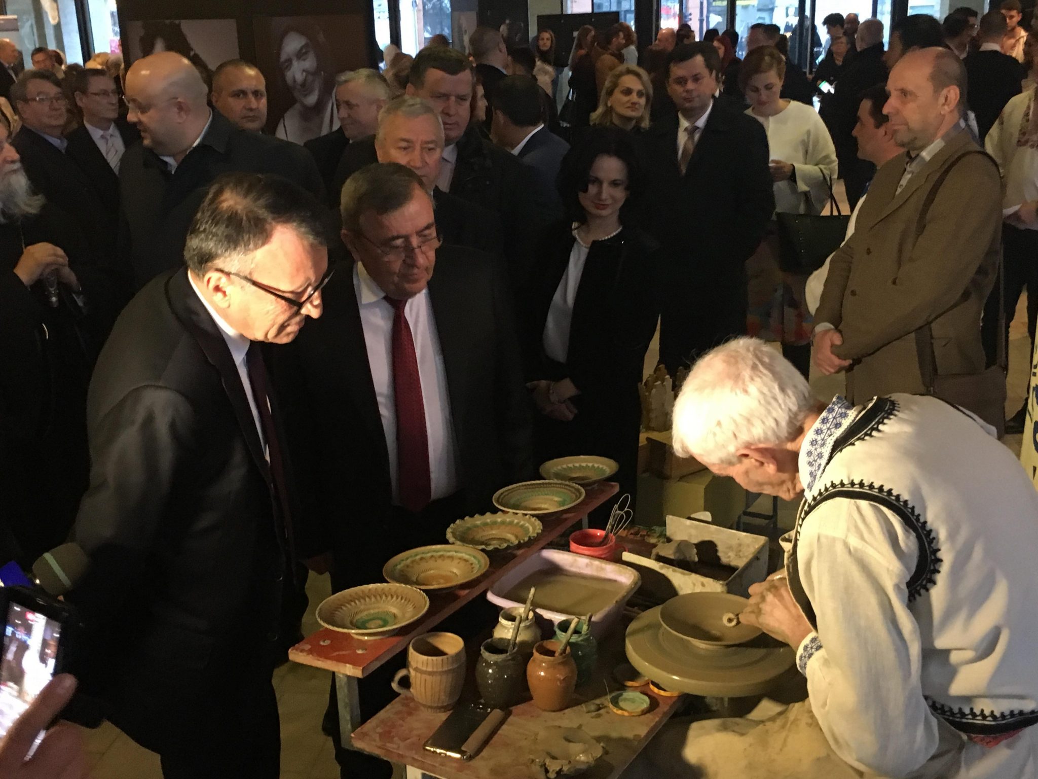 Atmosferă specifică satului oltenesc din vremuri apuse, miercuri, în foaierul Teatrului Marin Sorescu din Craiova! Atelierele de lucru ale meșterului olar din Gorj, cel al opincarului din Vâlcea, al picturii pe vase din ceramică, caierul de lână, furca și fusul mânuite cu pricepere, covoarele oltenești, mobilierul pictat manual, costumele populare vechi de sute de ani, păpușile îmbrăcate în straie populare și nu în ultimul rând mesele pline cu bucate alese pregătite de gospodinele din Dolj, toate acestea i-au bucurat pe craiovenii care miercuri au participat la Ziua Olteniei. În cadrul evenimentului, acestora li s-a oferit ocazia să facă fotografii în familie, în decor specific oltenesc, ideea aparținând reprezentanților Casei de Cultură „Traian Demetrescu” din Craiova. La ceas de seară, la eveniment au ajuns și oficialități, autoritățile locale având musafiri din București și din județele vecine.