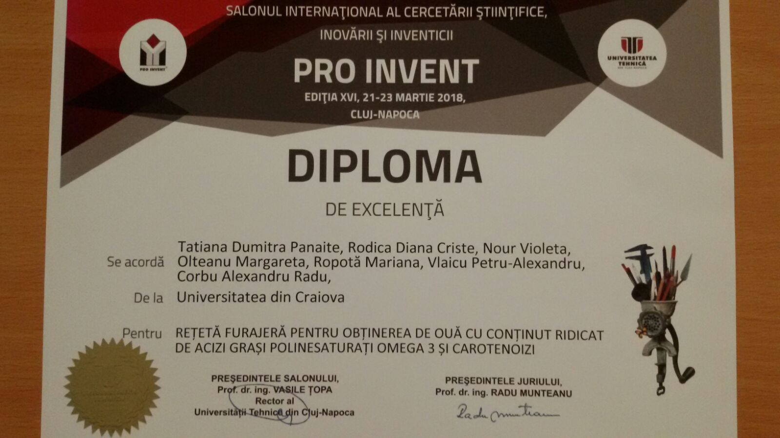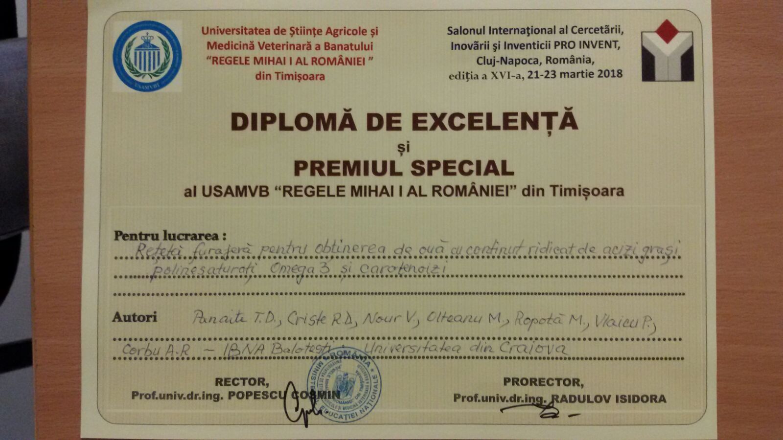 Lucrarea Rețetă furajeră pentru obținerea de ouă cu conținut ridicat de acizi grași polinesaturați omega-3 și carotenoizi a fost recunoscută prin Diploma de Excelenţă şi Premiul Special acordate de Universitatea de Ştiinţe Agricole şi Medicină Veterinară a Banatului „Regele Mihai I al României” din Timişoara, la Salonul Internațional al Cercetării, Inovării și Inventicii PRO INVENT, ediția a XVI-a, 21-23 martie 2018, Cluj-Napoca.
