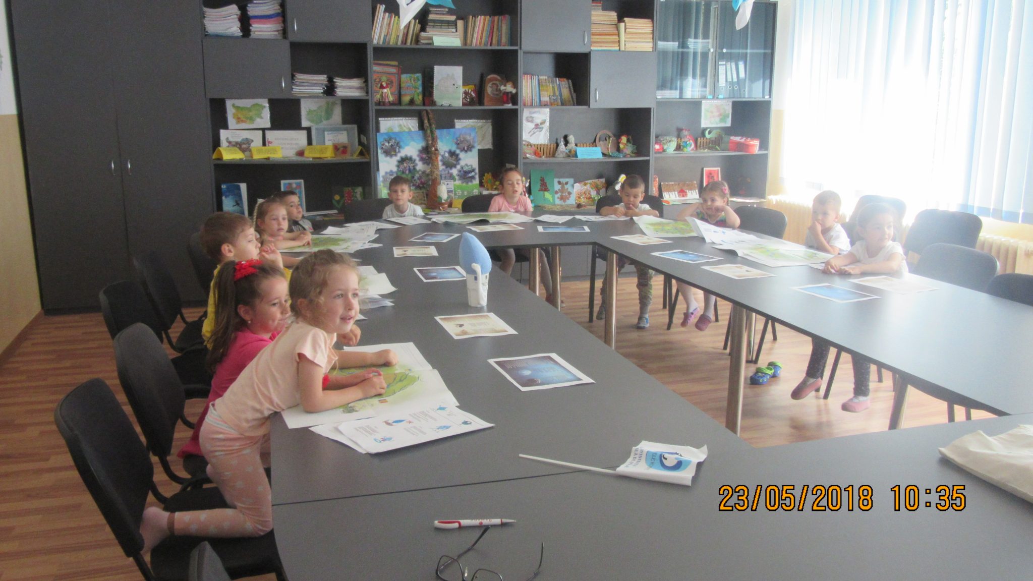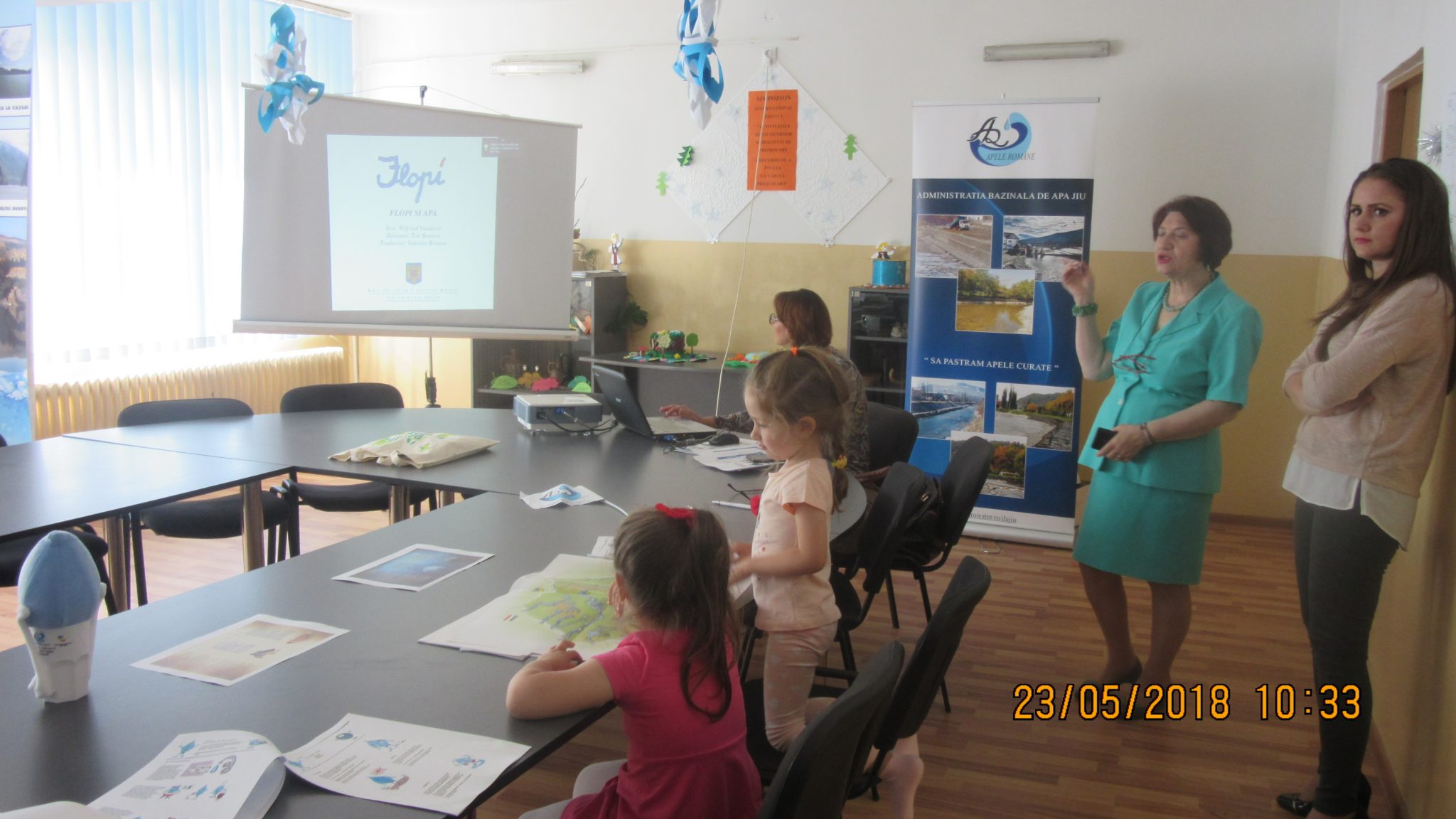 În a doua parte a întâlnirii preşcolarii au învăţat despre importanţa apei în viaţa noastră, cauzele poluării şi cum să evităm acest lucru, circuitul apei în natură şi peripeţiile peştişorului “Flopi” .