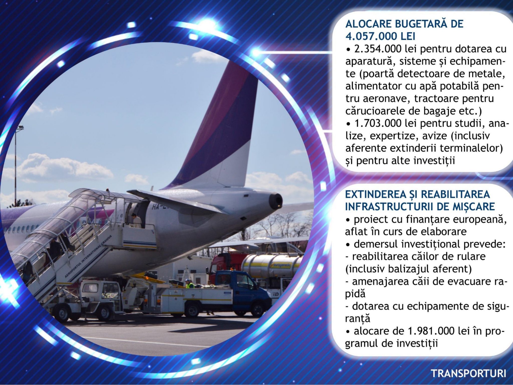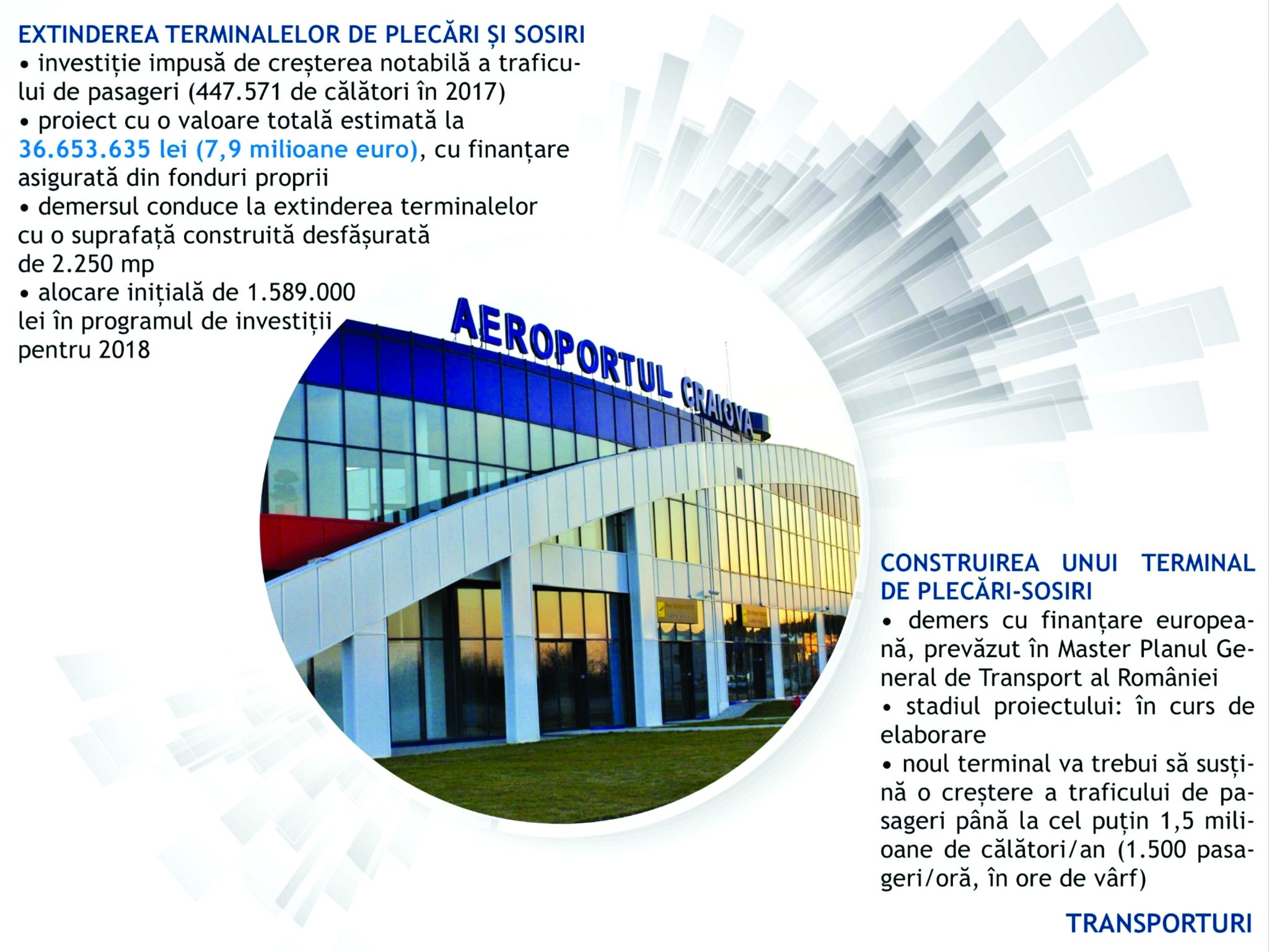 Toate acestea confirmă necesitatea demersului pe care îl derulăm din acest an, pentru extinderea terminalelor de plecări și sosiri. Investiția de aproape 8 milioane de euro va contribui în mod semnificativ la dezvoltarea aeroportului, deoarece va crea condiții pentru procesarea pasagerilor din 4 aeronave simultan și va putea susține o creștere a traficului până la aproximativ 900.000 de călători anual”, a afirmat Ion Prioteasa.