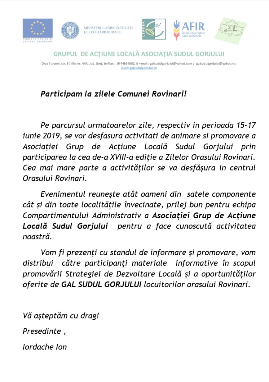 Pe parcursul urmatoarelor zile, respectiv in perioada 15-17 iunie 2019, se vor desfasura activitati de animare si promovare a Asociației Grup de Acțiune Locală Sudul Gorjului prin participarea la cea de-a XVIII-a ediție a Zilelor Orasului Rovinari. Cea mai mare parte a activităților se va desfășura in centrul Orasului Rovinari.