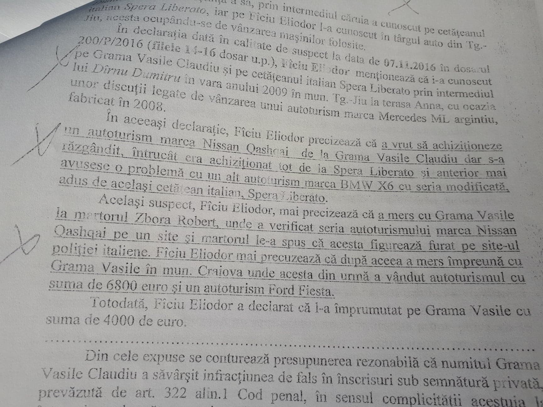 „În dosarul nr.200/P/2016 cercetat până anul trecut, dar clasat de procurorul Ionela Bertha au fost urmăriți penal nu doar Grama și Fîciu, ci și alte șapte persoane, printre care un cetățean italian, privind felul în care au constituit rețeaua de comercializare a unor mașini furate din străinătate. În cuprinsul dosarului se enumeră câteva dintre mașinile de lux vândute de gruparea din care a făcut parte Grama și preotul Fîciu, grupare care a intrat în vizorul anchetatorilor încă din anul 2009. Prima mașină care pornește ancheta și sesizarea IPJ Gorj – Serviciul de Investigații Criminale este o Dacia Logan care se dovedește furată din Ungaria. Aceeași persoană care ajunge să fie urmărită penal pentru tăinuire se dovedește că nu este străină nici de vânzarea autoturismului Mercedes CLC 220 CDI și nici de cea a unui VW Passat. O altă persoană cercetată în acest dosar vinde un Audi A4, în 2009, furat din Spania. Mașina ajunge în atenția anchetatorilor în februarie 2010, împotriva preotului Fîciu și a lui Ciugudean DAN fiind începută urmărirea penală pentru tăinuire. Tot atunci, polițiștii români au dispus începerea urmăririi penale pentru Spera Liberato, vinovat pentru înstrăinarea mai multor autoturisme mărcile BMW X6, Porsche Cayenne, Audi Q7 și Mercedes, ce urmau să fie puse în urmărire ca furate din alte state. Preotul Fîciu Eliodor ajunge în februarie 2010 să fie urmărit penal pentru înșelăciune privind înstrăinarea unui Audi Q7, ce figura furat din Italia. În aceeași zi este pus sub urmărire penală și Vasile Grama, el pentru mașina Nissan furată din Italia și cumpărată de bună credință de Bărbosu. Tot Grama se face vinovat de vânzarea unui Audi A4 și a unui Porsche Cayenne, ambele furate din Spania și a unui Mitsubishi 1200 comercializat cu acte false. Tot Grama mai înstrăinează un Audi A6 furat tot din Italia”, au notat jurnaliştii de la gorjeanul.ro.