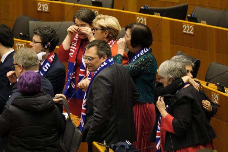 Imediat după vot, care a pecetluit plecarea eurodeputaţilor britanici, numeroşi europarlamentari şi-au dat mâna în hemiciclu şi au intonat cântecul scoţian de rămas bun „Auld Lang Syne” (Nu este decât la revedere), unii fluturând eşarfe în culorile drapelelor britanic şi european. Eurodeputații britanici anti-Brexit nu și-au ascuns părerea de rău, și-au îmbrățișat colegii și au plâns.