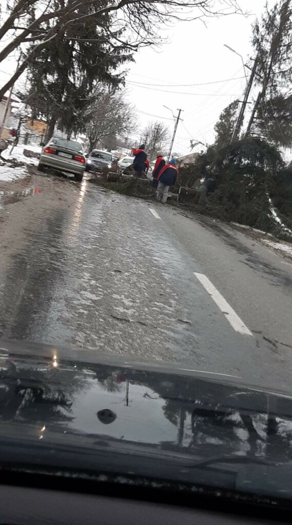 In Melinesti, vantul puternic a rupt copaci de pe marginea drumului si i-a doborat la pamant.