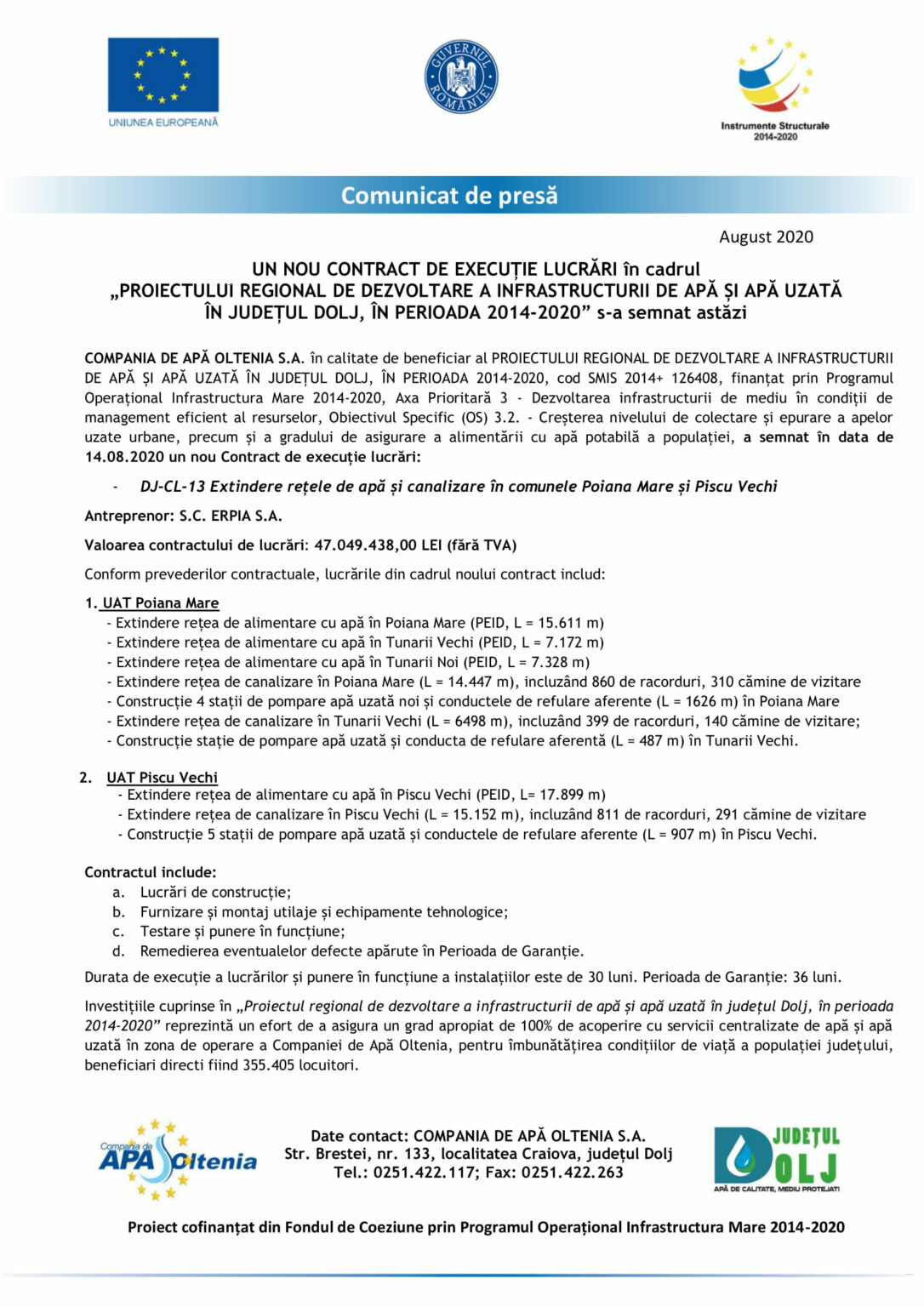 ActualitateDoljOlteniaUN NOU CONTRACT DE EXECUȚIE LUCRĂRI în cadrul „PROIECTULUI REGIONAL DE DEZVOLTARE A INFRASTRUCTURII DE APĂ ȘI APĂ UZATĂ ÎN JUDEȚUL DOLJ, ÎN PERIOADA 2014-2020” s-a semnat astăzi Jurnalul Olteniei 14 august 2020 Share SHARE Jurnalul Olteniei See Full Bio TAGGED:CAOcompania de apa olteniainfrastructura Distribuie acest articol Facebook Whatsapp Whatsapp Email Copy Link Print Articolul precedent INS: Economia României a scăzut cu 12,3% Articolul următor ANPC: Dezinfectant de mâini toxic, în magazine Ultima ora CE Oltenia raportează emisii scăzute de dioxid de carbon 5 decembrie 2025 DIICOT a destructurat un grup de proxenetism în Mehedinți 5 decembrie 2025 Legea pensiilor magistraților, atacată, din nou, la CCR 5 decembrie 2025 Magia Crăciunului Târgu Jiu: Seară de neuitat 5 decembrie 2025 A dat bancnote false cu „Prop Copy”: Percheziții în Mehedinți 5 decembrie 2025 Căprioare și ponei, de Crăciun, în Parcul Romanescu 5 decembrie 2025 Gorj: agresori reținuți și monitorizați electronic 5 decembrie 2025 Suspect de tentativă de agresiune reținut de Poliția Dolj 5 decembrie 2025 Locuință din Gorj cuprinsă de flăcări 5 decembrie 2025 Distribuție Oltenia: Oltenii, mai interesați de energie și sustenabilitate 5 decembrie 2025