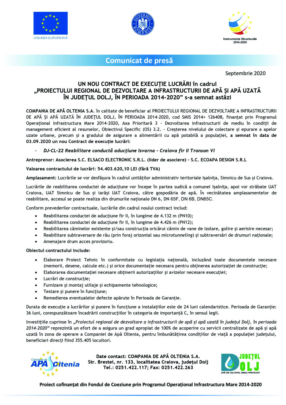 ActualitateDoljOlteniaUN NOU CONTRACT DE EXECUȚIE LUCRĂRI în cadrul „PROIECTULUI REGIONAL DE DEZVOLTARE A INFRASTRUCTURII DE APĂ ȘI APĂ UZATĂ ÎN JUDEȚUL DOLJ, ÎN PERIOADA 2014-2020” s-a semnat astăzi Jurnalul Olteniei 3 septembrie 2020 Share SHARE Jurnalul Olteniei See Full Bio TAGGED:apaapa uzataCAOcompania de apa Distribuie acest articol Facebook Whatsapp Whatsapp Email Copy Link Print Articolul precedent Gorj. Zeci de cadre didactice renunţă la catedră de teama infectării cu noul coronavirus Articolul următor Studiu: Tratarea cu steroizi a bolnavilor de Covid-19 aflaţi în stare critică reduce riscul de deces cu 20% Ultima ora Căprioare și ponei, de Crăciun, în Parcul Romanescu 5 decembrie 2025 Gorj: agresori reținuți și monitorizați electronic 5 decembrie 2025 Suspect de tentativă de agresiune reținut de Poliția Dolj 5 decembrie 2025 Locuință din Gorj cuprinsă de flăcări 5 decembrie 2025 Distribuție Oltenia: Oltenii, mai interesați de energie și sustenabilitate 5 decembrie 2025 Semimaratonul Craiovei 2025: Record de participanți 5 decembrie 2025 Sancțiuni de peste 40.000 lei și o activitate suspendată la Băbeni 5 decembrie 2025 Oltenia, sub cod galben de vânt. Avertizare ANM 5 decembrie 2025 Lansare proiect: „Împădurirea unui teren agricol în comuna Dobrești, beneficiar SEINEA ILEANA-MIHAELA „ 5 decembrie 2025 Flăcări în toiul nopții la Berislăvești! Pompierii vâlceni au salvat locuința cuprinsă de incendiu 5 decembrie 2025
