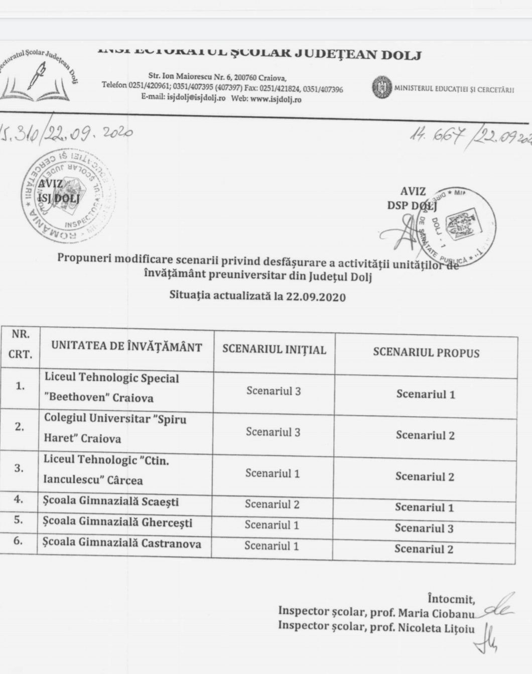 Conform Prefecturii Dolj, situația cazurilor pozitive cu Covid 19 în unitățile școlare din jud. Dolj, in saptamana 14 -20.09.2020, este urmatoarea:
