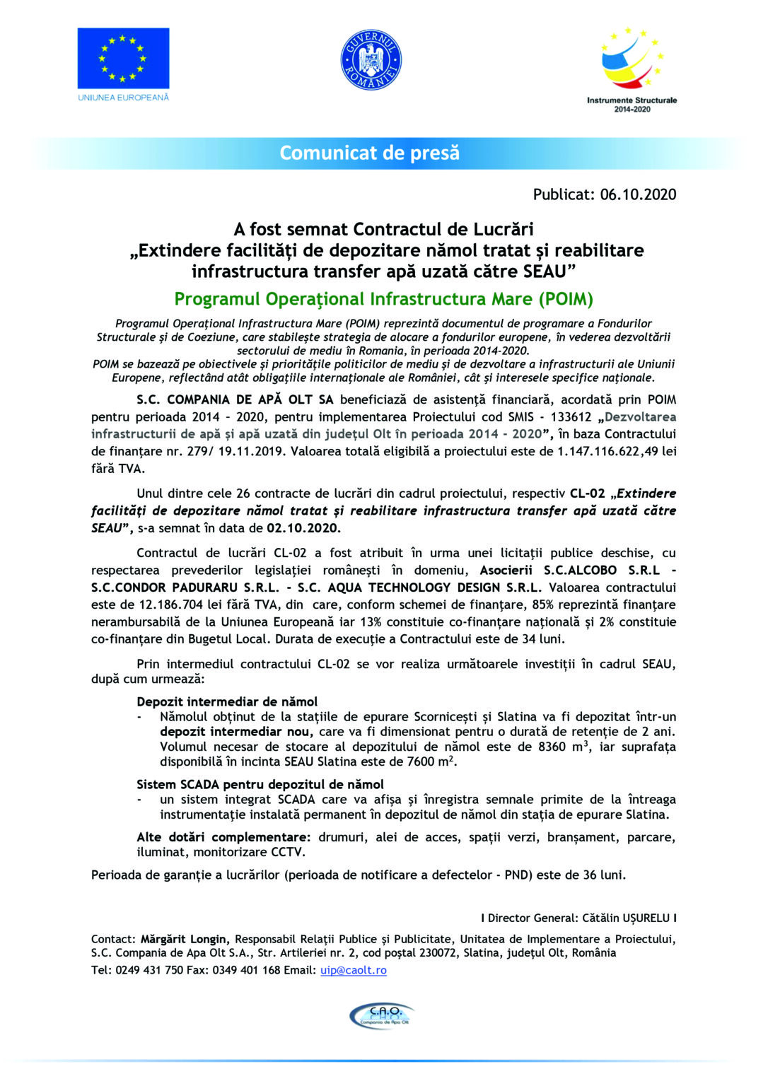 ActualitateOltOlteniaA fost semnat Contractul de Lucrări „Extindere facilități de depozitare nămol tratat și reabilitare infrastructura transfer apă uzată către SEAU” Jurnalul Olteniei 6 decembrie 2022 Share SHARE Jurnalul Olteniei See Full Bio TAGGED:apa uzatacompania de apa oltextindere facilitati de depozitarelucrarinamol tratat Distribuie acest articol Facebook Whatsapp Whatsapp Email Copy Link Print Articolul precedent A fost reluată circulaţia feroviară pe ruta directă Slatina – Piatra Olt Articolul următor Măștile faciale, ineficiente pe timp de ploaie Ultima ora Legea pensiilor magistraților, atacată, din nou, la CCR 5 decembrie 2025 Magia Crăciunului Târgu Jiu: Seară de neuitat 5 decembrie 2025 A dat bancnote false cu „Prop Copy”: Percheziții în Mehedinți 5 decembrie 2025 Căprioare și ponei, de Crăciun, în Parcul Romanescu 5 decembrie 2025 Gorj: agresori reținuți și monitorizați electronic 5 decembrie 2025 Suspect de tentativă de agresiune reținut de Poliția Dolj 5 decembrie 2025 Locuință din Gorj cuprinsă de flăcări 5 decembrie 2025 Distribuție Oltenia: Oltenii, mai interesați de energie și sustenabilitate 5 decembrie 2025 Semimaratonul Craiovei 2025: Record de participanți 5 decembrie 2025 Sancțiuni de peste 40.000 lei și o activitate suspendată la Băbeni 5 decembrie 2025