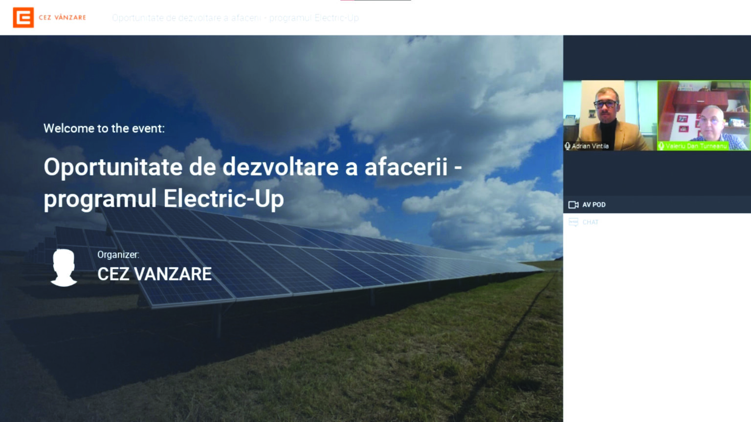 Pentru a sprijini business-urile locale, CEZ Vânzare organizează întâlniri online cu clienții în vederea promovării programului național Electric-UP. Astfel, aceștia au posibilitatea de a afla despre oportunitățile de dezvoltare a afacerii, prin prezentarea aspectelor legate de modalitatea de finanțare a proiectelor de investiții pentru reducerea costurilor. Suma cu care poate fi finanțat beneficiarul poate ajunge până la 100.000 EURO, beneficiarul nefiind nevoit să vină cu un aport propriu în cadrul programului.