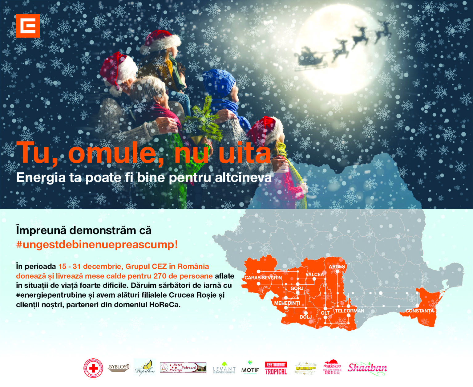 În apropierea sărbătorilor de iarnă, în perioada 15 – 31 decembrie, copii instituționalizați, victime ale violenței domestice, vârstnici sau familii sărace vor beneficia de mese calde formate din mic dejun, prânz și cină, pregătite de clienții CEZ din domeniul HoReCa. Scopul este de a dărui acestor oameni speranță și energie bună într-un context nesigur, în care este foarte important să rămânem #împreună.