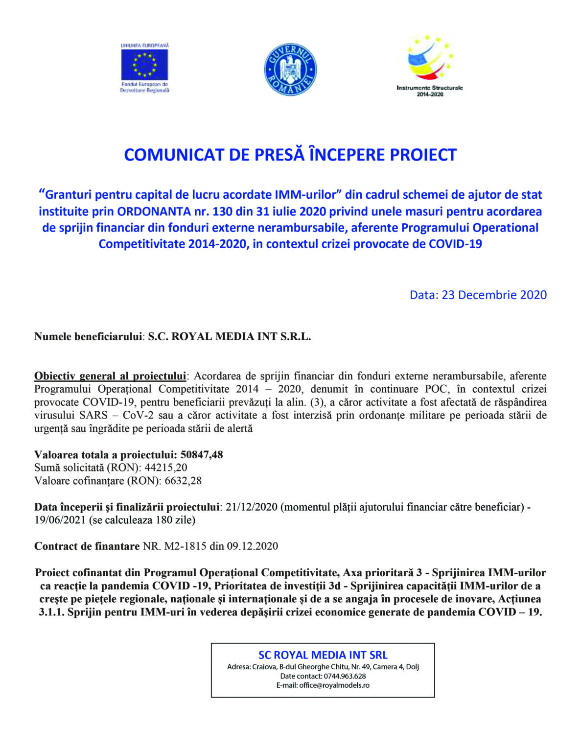 „Granturi pentru capital de lucru acordate IMM-urilor” din cadrul schemei de ajutor de stat instituite prin ORDONANȚA nr. 130 din 31 iulie 2020 privind unele măsuri pentru acordarea de sprijin financiar din fonduri externe nerambursabile, aferente Programului Operațional Competitivitate 2014-2020, în contextul crizei provocate de COVID-19