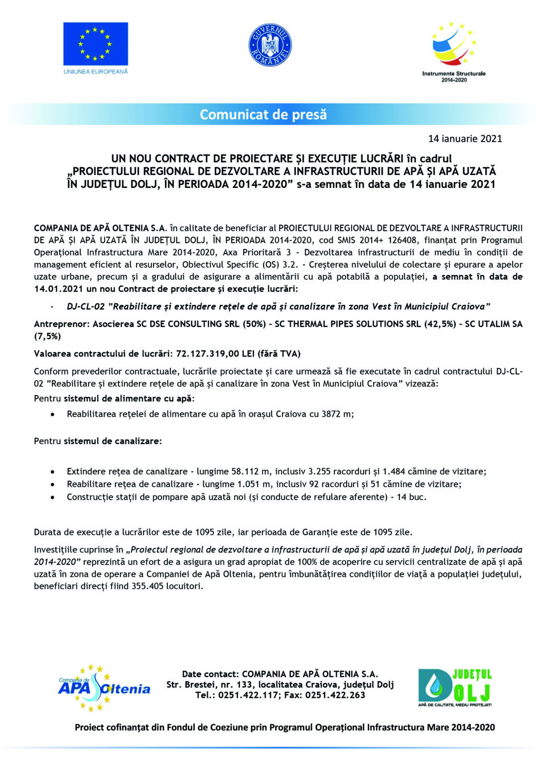 ActualitateDoljOlteniaUn nou contract de proiectare și execuție lucrări în cadrul „Proiectului Regional de dezvoltare a infrastructurii de apă și apă uzată în județul Dolj, în perioada 2014-2020” s-a semnat în data de 14 ianuarie 2021 Jurnalul Olteniei 14 ianuarie 2021 Share SHARE Jurnalul Olteniei See Full Bio TAGGED:apăapă uzatacontractdoljexecutielucrariproiectare Distribuie acest articol Facebook Whatsapp Whatsapp Email Copy Link Print Articolul precedent Marile companii ale lumii pun bazele ”pașapoartelor de vaccinare”! Articolul următor Germania: Noile tulpini pot agrava pandemia! Care este soluția salvatoare Ultima ora Căprioare și ponei, de Crăciun, în Parcul Romanescu 5 decembrie 2025 Gorj: agresori reținuți și monitorizați electronic 5 decembrie 2025 Suspect de tentativă de agresiune reținut de Poliția Dolj 5 decembrie 2025 Locuință din Gorj cuprinsă de flăcări 5 decembrie 2025 Distribuție Oltenia: Oltenii, mai interesați de energie și sustenabilitate 5 decembrie 2025 Semimaratonul Craiovei 2025: Record de participanți 5 decembrie 2025 Sancțiuni de peste 40.000 lei și o activitate suspendată la Băbeni 5 decembrie 2025 Oltenia, sub cod galben de vânt. Avertizare ANM 5 decembrie 2025 Lansare proiect: „Împădurirea unui teren agricol în comuna Dobrești, beneficiar SEINEA ILEANA-MIHAELA „ 5 decembrie 2025 Flăcări în toiul nopții la Berislăvești! Pompierii vâlceni au salvat locuința cuprinsă de incendiu 5 decembrie 2025