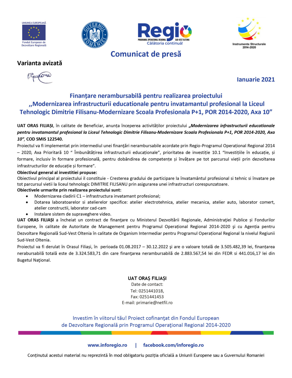 ActualitateDoljOlteniaFinanțare nerambursabilă pentru realizarea proiectului „Modernizarea infrastructurii educaționale pentru învățământul profesional la Liceul Tehnologic Dimitrie Filișanu – Modernizare Școală profesională P+1, POR 2014-2020, Axa 10” Jurnalul Olteniei 28 ianuarie 2021 Share SHARE Jurnalul Olteniei See Full Bio TAGGED:educatiefinantareinfrastructurainvatamant profesionalmodernizareproiect Distribuie acest articol Facebook Whatsapp Whatsapp Email Copy Link Print Articolul precedent Experții germani: Vaccinul AstraZeneca să nu fie administrat persoanelor de peste 65 de ani Articolul următor Reghe la Craiova! Cu ce staff vine antrenorul! Ultima ora Gorj: agresori reținuți și monitorizați electronic 5 decembrie 2025 Suspect de tentativă de agresiune reținut de Poliția Dolj 5 decembrie 2025 Locuință din Gorj cuprinsă de flăcări 5 decembrie 2025 Distribuție Oltenia: Oltenii, mai interesați de energie și sustenabilitate 5 decembrie 2025 Semimaratonul Craiovei 2025: Record de participanți 5 decembrie 2025 Sancțiuni de peste 40.000 lei și o activitate suspendată la Băbeni 5 decembrie 2025 Oltenia, sub cod galben de vânt. Avertizare ANM 5 decembrie 2025 Lansare proiect: „Împădurirea unui teren agricol în comuna Dobrești, beneficiar SEINEA ILEANA-MIHAELA „ 5 decembrie 2025 Flăcări în toiul nopții la Berislăvești! Pompierii vâlceni au salvat locuința cuprinsă de incendiu 5 decembrie 2025 Un fost jucător de la Universitatea Craiova, inclus în echipa lunii noiembrie, în Liga 2 5 decembrie 2025