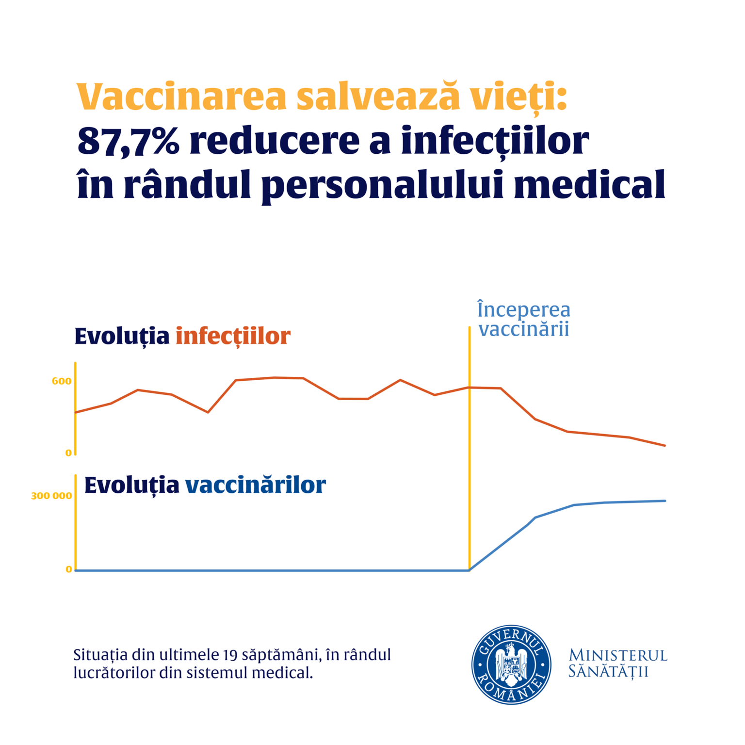 ” În contextul pandemic traversat și de România, interesul fundamental de sănătate publică a vizat și vizează vaccinarea cât mai multor persoane într-o perioadă scurtă de timp. Conform Strategiei naționale de vaccinare împotriva COVID-19, adoptată prin HG 1031/2020, campania de vaccinare a debutat în România la data de 27 decembrie 2020 și s-a adresat personalului medical din domeniile sănătății și social, aflat în prima linie în lupta împotriva SARS-COV-2. Menționăm că populația eligibilă din această etapă a fost stabilită în baza catagrafiei efectuate înaintea debutului campaniei de vaccinare și estimată la aproximativ 250.000 de persoane. De la debutul campaniei de vaccinare, au fost vaccinate cu ambele doze de vaccin peste 224.000 de persoane, iar cu prima doză de vaccin peste 247.000 de persoane din Etapa I.La data de 15 februarie 2021, specialiștii grupului medical au realizat o primă evaluare a datelor colectate la nivel național, privind vaccinarea personalului medical din Etapa I, vaccinat cu doza I și doza a II-a de vaccin. Acestea au fost corelate cu Platforma Coronaforms, operaționalizată pentru raportarea cazurilor confirmate de infecție cu SARS-CoV-2.Analiza a relevat faptul că în ultimele patru săptămâni, s-a înregistrat o scădere progresivă a cazurilor confirmate în rândul personalului medical, cu peste 87% față de ultima săptămână a anului 2020. Precizăm că această scădere este dublă față de cea înregistrată în rândul populației generale, în aceeași perioadă de timp.”, conform comunicatului de presă al Ministerului Sănătăţii.