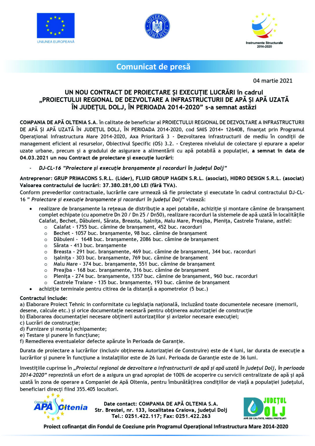 DoljEconomieOlteniaUN NOU CONTRACT DE PROIECTARE ȘI EXECUȚIE LUCRĂRI în cadrul „PROIECTULUI REGIONAL DE DEZVOLTARE A INFRASTRUCTURII DE APĂ ȘI APĂ UZATĂ ÎN JUDEȚUL DOLJ, ÎN PERIOADA 2014-2020” s-a semnat astăzi Jurnalul Olteniei 4 martie 2021 Share SHARE Jurnalul Olteniei See Full Bio TAGGED:apaapa uzatacontractdezvoltareexecutie lucrariinfrastructuraproiect regionalproiectare Distribuie acest articol Facebook Whatsapp Whatsapp Email Copy Link Print Articolul precedent Caracal. Zone de protecție, amenajate în apropierea trecerilor de pietoni Articolul următor Craiova: Pasajul Universității, închis pentru noi reparații Ultima ora CE Oltenia raportează emisii scăzute de dioxid de carbon 5 decembrie 2025 DIICOT a destructurat un grup de proxenetism în Mehedinți 5 decembrie 2025 Legea pensiilor magistraților, atacată, din nou, la CCR 5 decembrie 2025 Magia Crăciunului Târgu Jiu: Seară de neuitat 5 decembrie 2025 A dat bancnote false cu „Prop Copy”: Percheziții în Mehedinți 5 decembrie 2025 Căprioare și ponei, de Crăciun, în Parcul Romanescu 5 decembrie 2025 Gorj: agresori reținuți și monitorizați electronic 5 decembrie 2025 Suspect de tentativă de agresiune reținut de Poliția Dolj 5 decembrie 2025 Locuință din Gorj cuprinsă de flăcări 5 decembrie 2025 Distribuție Oltenia: Oltenii, mai interesați de energie și sustenabilitate 5 decembrie 2025