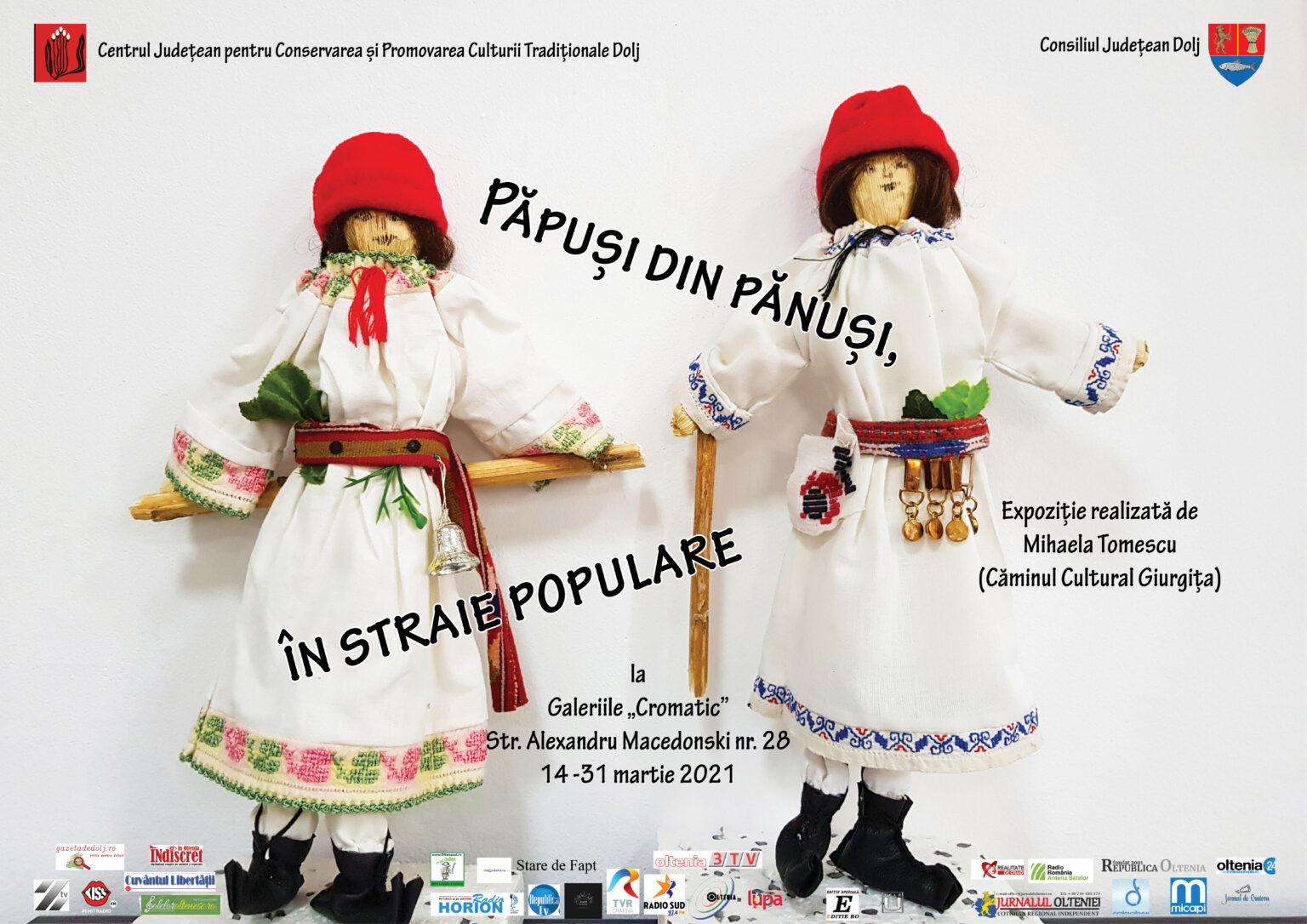 Centrul Judeţean pentru Conservarea şi Promovarea Culturii Tradiţionale Dolj întâmpină Lăsata Secului de carne și intrarea în Postul mare al Paștelui, duminică, 14 martie 2021, cu o expoziție de păpuși din pănuși, împodobite cu straie tradiționale, realizate de Mihaela Tomescu, directorul Căminului Cultural din comuna Giurgița, județul Dolj.
