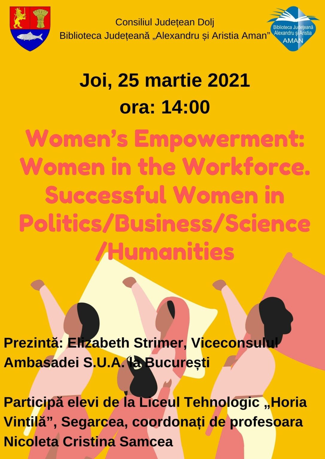 Viceconsulul Ambasadei S.U.A. la București, Elizabeth Strimer, susține o conferință, online, pe tema „Women’s Empowerment: Women in the Workforce. Successful Women in Politics/Business/Science/Humanities”, la Biblioteca Județeană „Alexandru și Aristia Aman”.