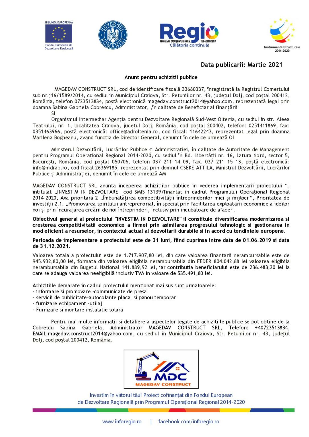 DoljEconomieOlteniaAnunt pentru achizitii publice – MAGEDAV CONSTRUCT SRL Jurnalul Olteniei 5 aprilie 2021 Share SHARE Jurnalul Olteniei See Full Bio Distribuie acest articol Facebook Whatsapp Whatsapp Email Copy Link Print Articolul precedent INVESTIM IN DEZVOLTARE – MAGEDAV CONSTRUCT SRL Articolul următor Țările europene adoptă măsuri mult mai stricte pentru perioada Paștelui Ultima ora Salonul Anual de Artă 2025, eveniment major în Mehedinți 13 decembrie 2025 Ștefan Hrușcă vine în premieră la Târgul de Crăciun Craiova 13 decembrie 2025 Tragedie în Gorj: pieton ucis într-un accident violent 13 decembrie 2025 Protest la Craiova pentru justiție și împotriva corupției 12 decembrie 2025 Alertă alimentară: Lapte NAN Nestlé retras urgent din magazine 12 decembrie 2025 Cadouri cool de Crăciun pentru adolescenți 12 decembrie 2025 Satul oltenesc la Craiova. Tradiții de iarnă 12 decembrie 2025 Premieră medicală la Spitalul Craiova: Procedură fără tăieturi pentru o boală rară a esofagului 12 decembrie 2025 Editura Nemira lansează un experiment A.I. care arată cum i-ar putea afecta pe adolescenți noua programă pentru pentru limba și literatura română propusă de Ministerul Educației și Cercetării 12 decembrie 2025 Polițist din Dolj, reținut pentru luare de mită: „Ierta” vitezomanii în schimbul banilor 12 decembrie 2025