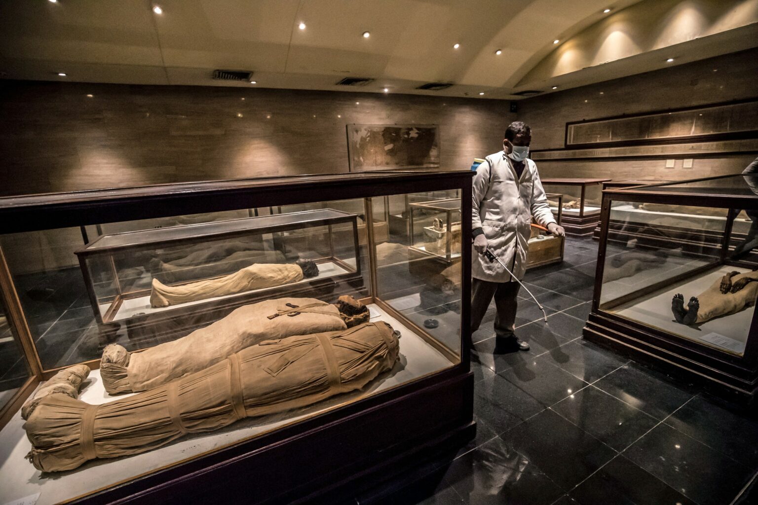 A worker disinfects the Royal Mummies Hall at the Egyptian Museum in Cairo's landmark Tahrir Square amid the coronavirus COVID-19 pandemic, on March 23, 2020.,Image: 508784429, License: Rights-managed, Restrictions: , Model Release: no