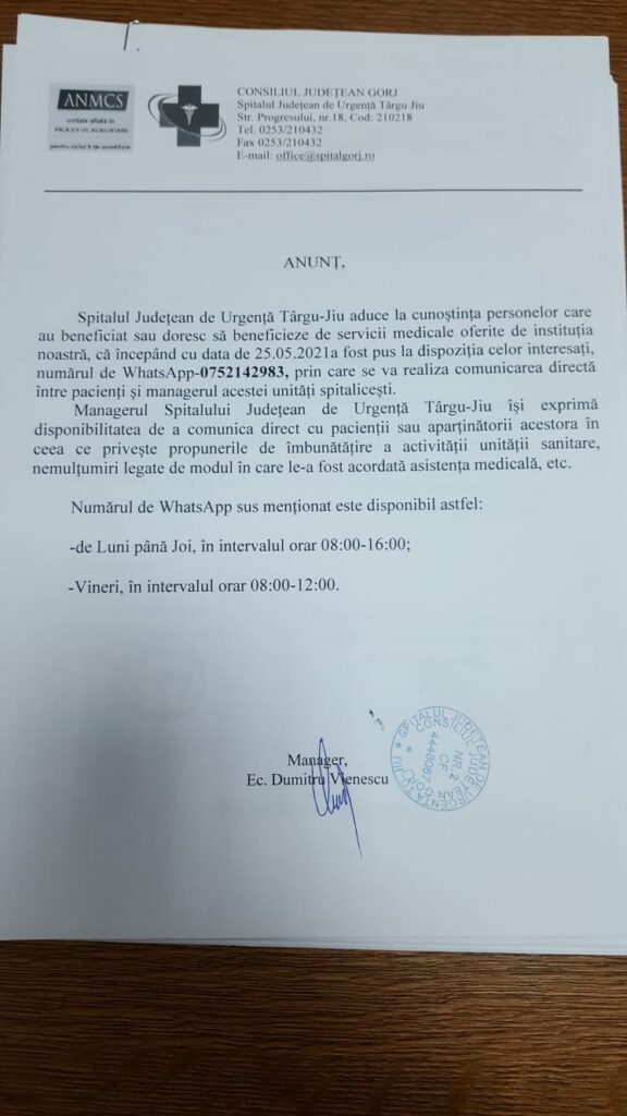 „Va aducem la cunostinta faptul ca incepand cu saptamana trecuta, pe site-ul spitalului, a fost publicat si pus la dispozitia pacientilor, un numar de telefon prin care se realizeaza, prin intermediul aplicației Whatsapp, comunicarea dintre pacienti sau apartinatori si managerul unitatii”, au transmis reprezentanții Spitalului Județean de Urgență Târgu Jiu.