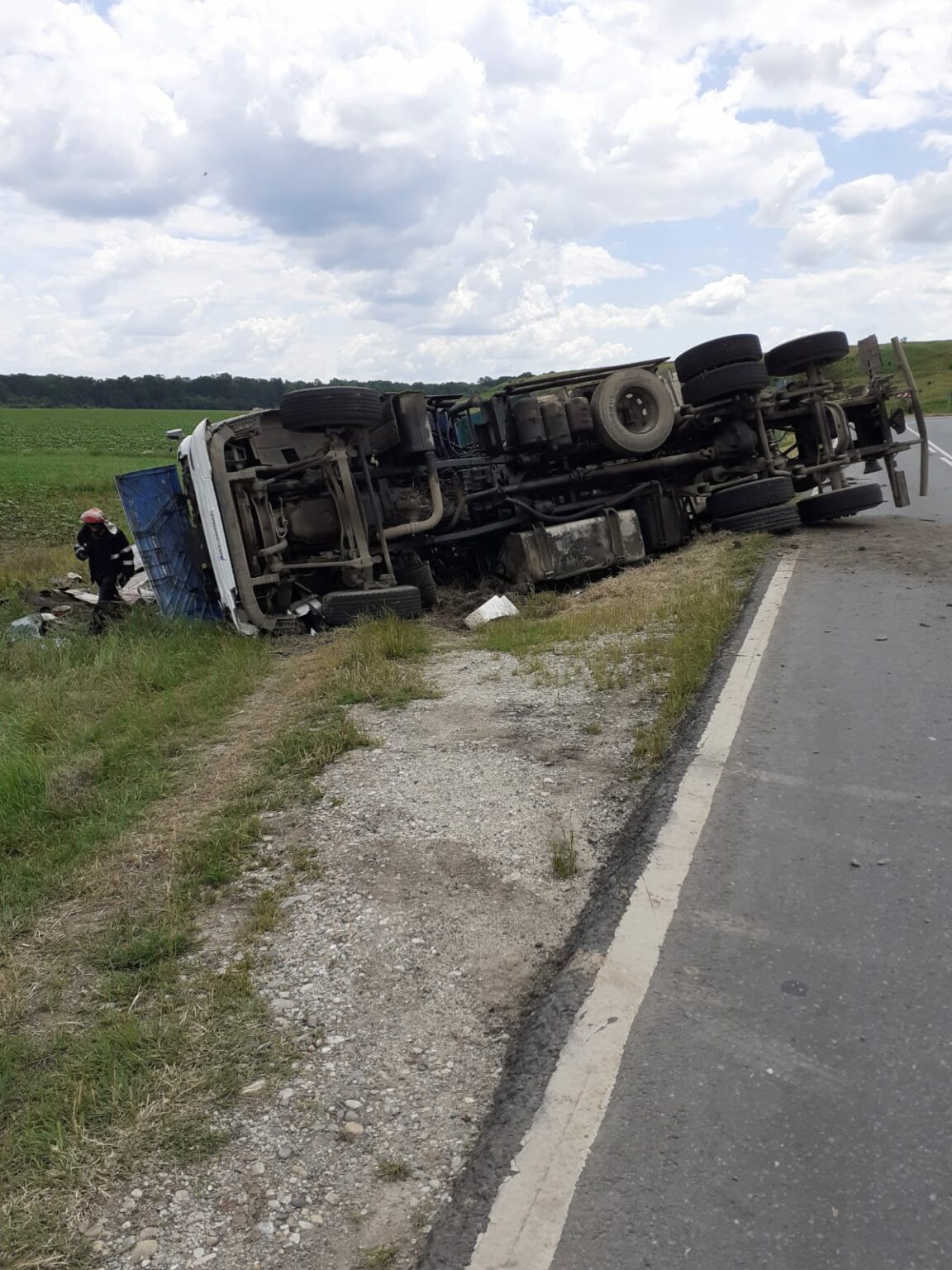 În accident a fost implicat un autotren, încărcat cu deșeuri feroase și neferoase, în care se afla doar șoferul.