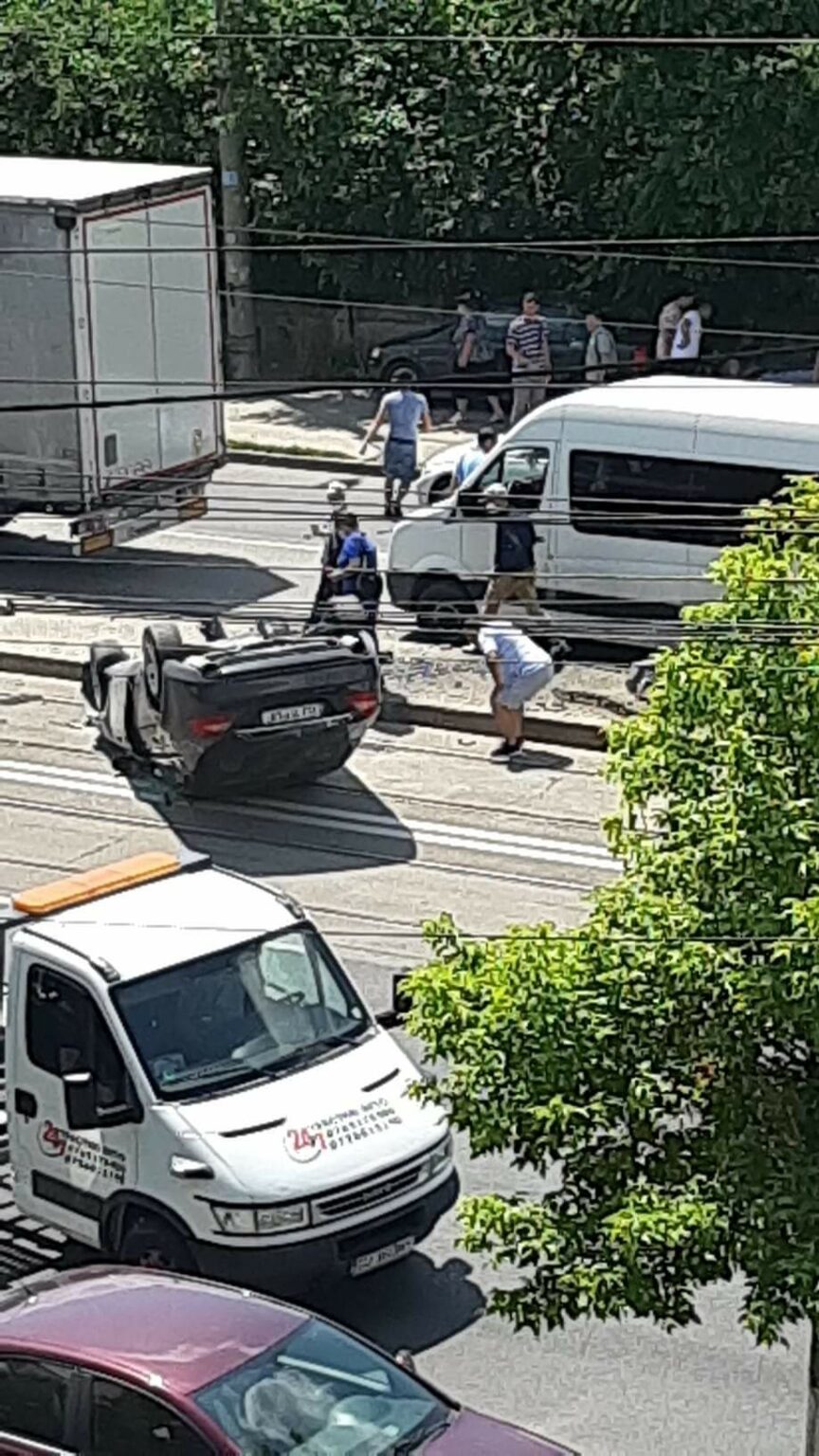 Accident pe strada Decebal din Craiova. O femeie s-a răsturnat cu mașina pe care o conducea, după ce a lovit un refugiu pentru pietoni.