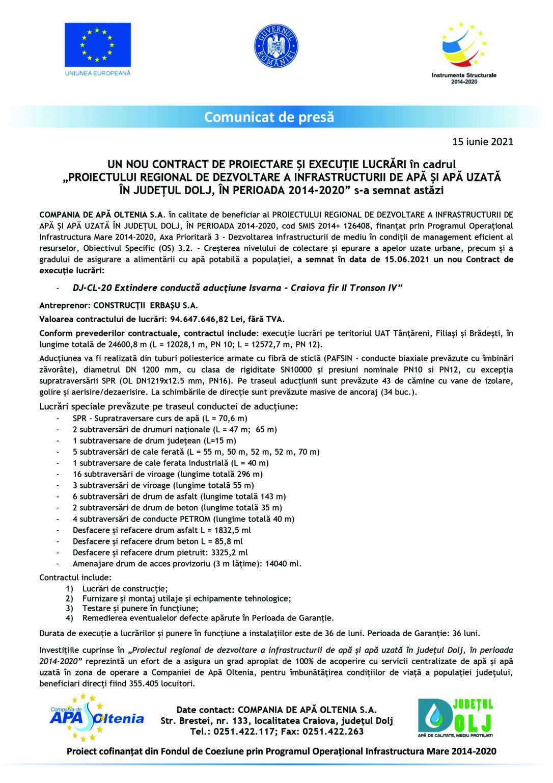 ActualitateDoljOlteniaUn nou contract de proiectare și execuție lucrări în cadrul „Proiectului regional de dezvoltare a infrastructurii de apă și apă uzată în județul Dolj, în perioada 2014-2020” s-a semnat astăzi Jurnalul Olteniei 15 iunie 2021 Share SHARE Jurnalul Olteniei See Full Bio TAGGED:apaapa uzatacontractdezvoltareexecutie lucrariinfrastructuraproiectare Distribuie acest articol Facebook Whatsapp Whatsapp Email Copy Link Print Articolul precedent Alocațiile copiilor, majorate de la 1 ianuarie 2022 Articolul următor România a cerut mai puține doze de vaccinuri anti-COVID, în iunie Ultima ora Magia Crăciunului Târgu Jiu: Seară de neuitat 5 decembrie 2025 A dat bancnote false cu „Prop Copy”: Percheziții în Mehedinți 5 decembrie 2025 Căprioare și ponei, de Crăciun, în Parcul Romanescu 5 decembrie 2025 Gorj: agresori reținuți și monitorizați electronic 5 decembrie 2025 Suspect de tentativă de agresiune reținut de Poliția Dolj 5 decembrie 2025 Locuință din Gorj cuprinsă de flăcări 5 decembrie 2025 Distribuție Oltenia: Oltenii, mai interesați de energie și sustenabilitate 5 decembrie 2025 Semimaratonul Craiovei 2025: Record de participanți 5 decembrie 2025 Sancțiuni de peste 40.000 lei și o activitate suspendată la Băbeni 5 decembrie 2025 Oltenia, sub cod galben de vânt. Avertizare ANM 5 decembrie 2025