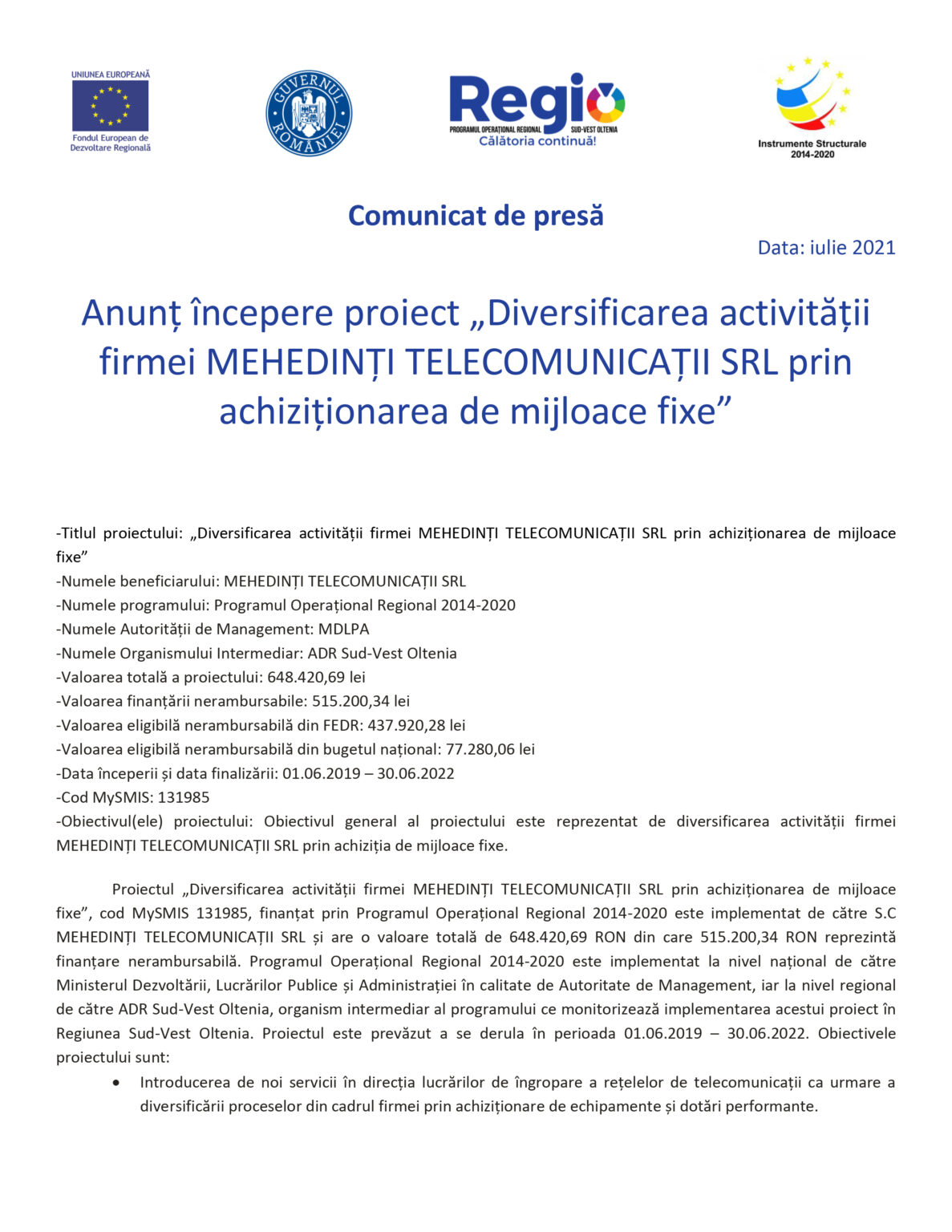 EconomieMehedințiAnunț începere proiect „Diversificarea activității firmei MEHEDINȚI TELECOMUNICAȚII SRL prin achiziționarea de mijloace fixe” Jurnalul Olteniei 8 iulie 2021 Share SHARE Jurnalul Olteniei See Full Bio TAGGED:achizitionaremijloace fixeproiect Distribuie acest articol Facebook Whatsapp Whatsapp Email Copy Link Print Articolul precedent Ce tip de parfum ar trebui să utilizați pentru fiecare ocazie Articolul următor Politica de transport a Uniunii pentru următorii 7 ani este subfinanțată și asta în cea mai grea perioadă Ultima ora CE Oltenia raportează emisii scăzute de dioxid de carbon 5 decembrie 2025 DIICOT a destructurat un grup de proxenetism în Mehedinți 5 decembrie 2025 Legea pensiilor magistraților, atacată, din nou, la CCR 5 decembrie 2025 Magia Crăciunului Târgu Jiu: Seară de neuitat 5 decembrie 2025 A dat bancnote false cu „Prop Copy”: Percheziții în Mehedinți 5 decembrie 2025 Căprioare și ponei, de Crăciun, în Parcul Romanescu 5 decembrie 2025 Gorj: agresori reținuți și monitorizați electronic 5 decembrie 2025 Suspect de tentativă de agresiune reținut de Poliția Dolj 5 decembrie 2025 Locuință din Gorj cuprinsă de flăcări 5 decembrie 2025 Distribuție Oltenia: Oltenii, mai interesați de energie și sustenabilitate 5 decembrie 2025
