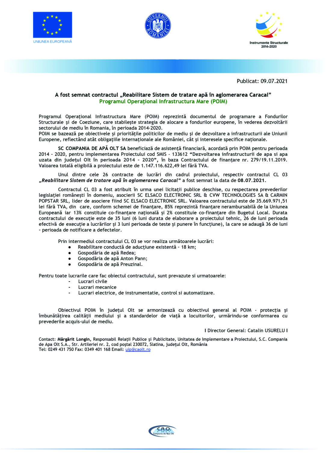 EconomieOltOlteniaA fost semnat contractul „Reabilitare Sistem de tratare apă în aglomerarea Caracal”. Programul Operațional Infrastructura Mare (POIM) Jurnalul Olteniei 6 decembrie 2022 Share SHARE Jurnalul Olteniei See Full Bio TAGGED:caracalcontractpoimreabilitaresistemtratare apa Distribuie acest articol Facebook Whatsapp Whatsapp Email Copy Link Print Articolul precedent BioNtech și Pfizer anunță că au dezvoltat un vaccin împotriva variantei Delta Articolul următor Mănăstirea Arnota din judeţul Vâlcea a sărbătorit 385 de ani de atestare documentară Ultima ora Gorj: agresori reținuți și monitorizați electronic 5 decembrie 2025 Suspect de tentativă de agresiune reținut de Poliția Dolj 5 decembrie 2025 Locuință din Gorj cuprinsă de flăcări 5 decembrie 2025 Distribuție Oltenia: Oltenii, mai interesați de energie și sustenabilitate 5 decembrie 2025 Semimaratonul Craiovei 2025: Record de participanți 5 decembrie 2025 Sancțiuni de peste 40.000 lei și o activitate suspendată la Băbeni 5 decembrie 2025 Oltenia, sub cod galben de vânt. Avertizare ANM 5 decembrie 2025 Lansare proiect: „Împădurirea unui teren agricol în comuna Dobrești, beneficiar SEINEA ILEANA-MIHAELA „ 5 decembrie 2025 Flăcări în toiul nopții la Berislăvești! Pompierii vâlceni au salvat locuința cuprinsă de incendiu 5 decembrie 2025 Un fost jucător de la Universitatea Craiova, inclus în echipa lunii noiembrie, în Liga 2 5 decembrie 2025
