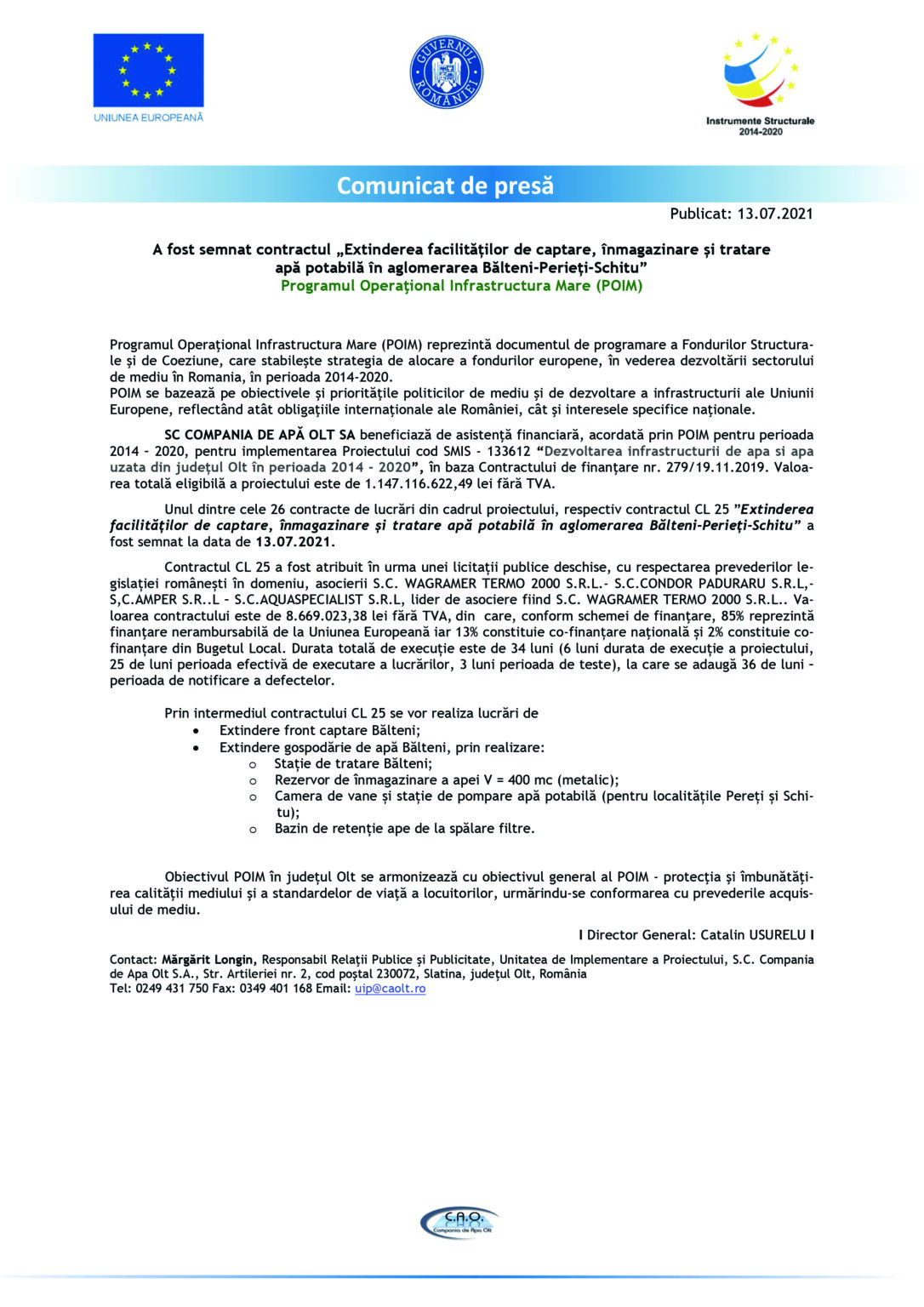 EconomieOltA fost semnat contractul „Extinderea facilităților de captare, înmagazinare și tratare apă potabilă în aglomerarea Bălteni-Perieți-Schitu”. Programul Operațional Infrastructura Mare (POIM) Jurnalul Olteniei 6 decembrie 2022 Share SHARE Jurnalul Olteniei See Full Bio TAGGED:apa potabilabaltenicontractextinderefacilitatiperietipoimschitusemnare Distribuie acest articol Facebook Whatsapp Whatsapp Email Copy Link Print Articolul precedent UE vrea să interzică vânzarea mașinilor pe benzină și motorină din 2035 Articolul următor Cel puțin 33 morți și zeci de dispăruți în Germania, din cauza ploilor și inundațiilor violente Ultima ora Dolj: Ajutoare sociale de peste 76 milioane lei 5 decembrie 2025 Cea de-a VII-a ediție a Semimaratonului Craiovei a avut loc sâmbătă, 18 octombrie 2025. 5 decembrie 2025 ANUNT PRIVIND ORGANIZAREA ACHIZITIEI DE UTILAJE . MINIEXCAVATOR – LOTUL 1, UTILAJ DE FORAT HIDRAULIC – LOTUL 2 – RELUATÃ 2 5 decembrie 2025 Modernizarea CF Filiași: Începe proiectarea 5 decembrie 2025 Testare gratuită HPV la Spitalul Județean Târgu Jiu 5 decembrie 2025 CE Oltenia raportează emisii scăzute de dioxid de carbon 5 decembrie 2025 DIICOT a destructurat un grup de proxenetism în Mehedinți 5 decembrie 2025 Legea pensiilor magistraților, atacată, din nou, la CCR 5 decembrie 2025 Magia Crăciunului Târgu Jiu: Seară de neuitat 5 decembrie 2025 A dat bancnote false cu „Prop Copy”: Percheziții în Mehedinți 5 decembrie 2025