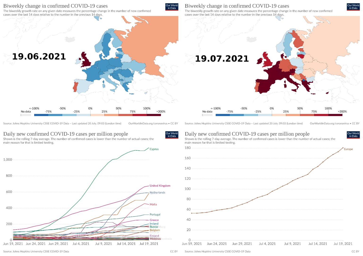– cu o lună în urmă, în majoritatea Europei incidența cazurilor era fie în stagnare, fie în scădere, câteva excepții fiind în Rusia, Portugalia și UK