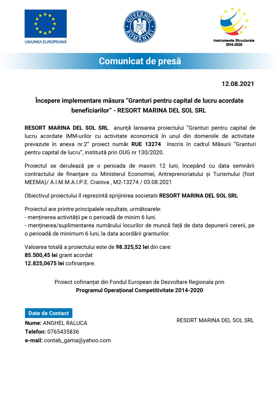 DoljEconomieÎncepere implementare măsura „Granturi pentru capital de lucru acordate beneficiarilor” – RESORT MARINA DEL SOL SRL Jurnalul Olteniei 20 august 2021 Share Autocolant SHARE Autocolant Jurnalul Olteniei See Full Bio TAGGED:granturiimplementare Distribuie acest articol Facebook Whatsapp Whatsapp Email Copy Link Print Articolul precedent 30 de copii aflați în tabără s-au întâlnit cu Jandarmii Vâlceni Articolul următor Peste 300 de amenzi au fost date de polițiștii olteni în doar patru ore Ultima ora Flăcări în toiul nopții la Berislăvești! Pompierii vâlceni au salvat locuința cuprinsă de incendiu 5 decembrie 2025 Un fost jucător de la Universitatea Craiova, inclus în echipa lunii noiembrie, în Liga 2 5 decembrie 2025 Rusia blochează platforma de jocuri online Roblox 5 decembrie 2025 Cupa României: clasamentul și rezultatele din grupe 5 decembrie 2025 Cloud Dancer – Culoarea anului 2026 aleasă de Pantone 5 decembrie 2025 Râmnicu Vâlcea deschide sezonul sărbătorilor cu o seară specială de Ajunul lui Moș Nicolae 4 decembrie 2025 Ecranele, „cadoul otrăvit” pentru copii de sărbători 5 decembrie 2025 Al doilea spectacol al Festivalului Colindului Vâlcean are loc la Vlădești 4 decembrie 2025 Universitatea Craiova câștigă la scor și urcă pe primul loc în grupa din Cupa României 5 decembrie 2025 Bărbat reținut pentru agresiune sexuală la Râmnicu Vâlcea 4 decembrie 2025