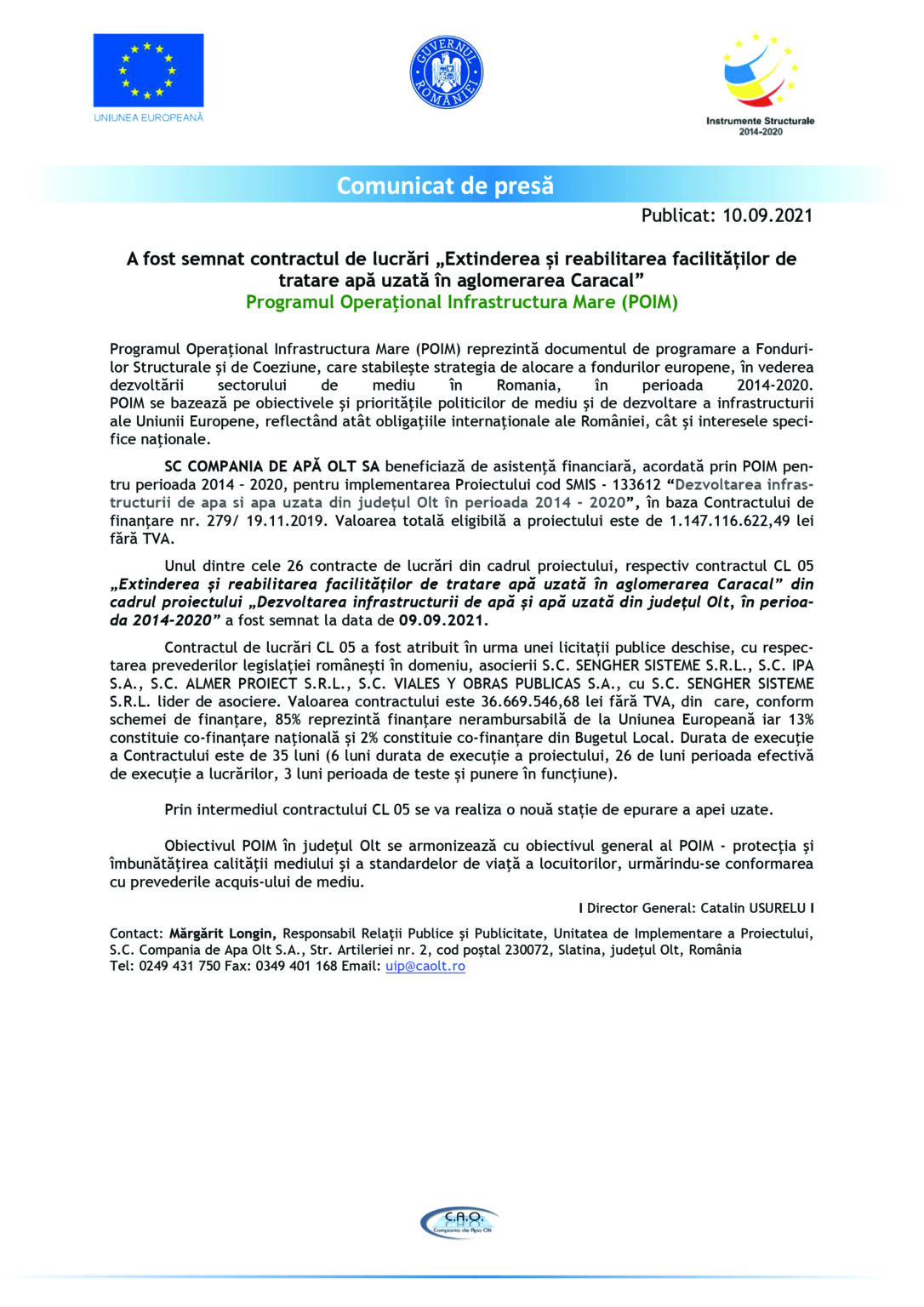 ActualitateEconomieOltOlteniaA fost semnat contractul de lucrări „Extinderea și reabilitarea facilităților de tratare apă uzată în aglomerarea Caracal”. Programul Operațional Infrastructura Mare (POIM) Jurnalul Olteniei 6 decembrie 2022 Share SHARE Jurnalul Olteniei See Full Bio TAGGED:contract lucrăriextinderefacilitatireabilitaretratare apa uzata Distribuie acest articol Facebook Whatsapp Whatsapp Email Copy Link Print Articolul precedent Elevii din Bechet vor începe cursurile în format online! Articolul următor Proiectil explozibil găsit de un cioban în Brebeni Ultima ora Dolj: Ajutoare sociale de peste 76 milioane lei 5 decembrie 2025 Cea de-a VII-a ediție a Semimaratonului Craiovei a avut loc sâmbătă, 18 octombrie 2025. 5 decembrie 2025 ANUNT PRIVIND ORGANIZAREA ACHIZITIEI DE UTILAJE . MINIEXCAVATOR – LOTUL 1, UTILAJ DE FORAT HIDRAULIC – LOTUL 2 – RELUATÃ 2 5 decembrie 2025 Modernizarea CF Filiași: Începe proiectarea 5 decembrie 2025 Testare gratuită HPV la Spitalul Județean Târgu Jiu 5 decembrie 2025 CE Oltenia raportează emisii scăzute de dioxid de carbon 5 decembrie 2025 DIICOT a destructurat un grup de proxenetism în Mehedinți 5 decembrie 2025 Legea pensiilor magistraților, atacată, din nou, la CCR 5 decembrie 2025 Magia Crăciunului Târgu Jiu: Seară de neuitat 5 decembrie 2025 A dat bancnote false cu „Prop Copy”: Percheziții în Mehedinți 5 decembrie 2025