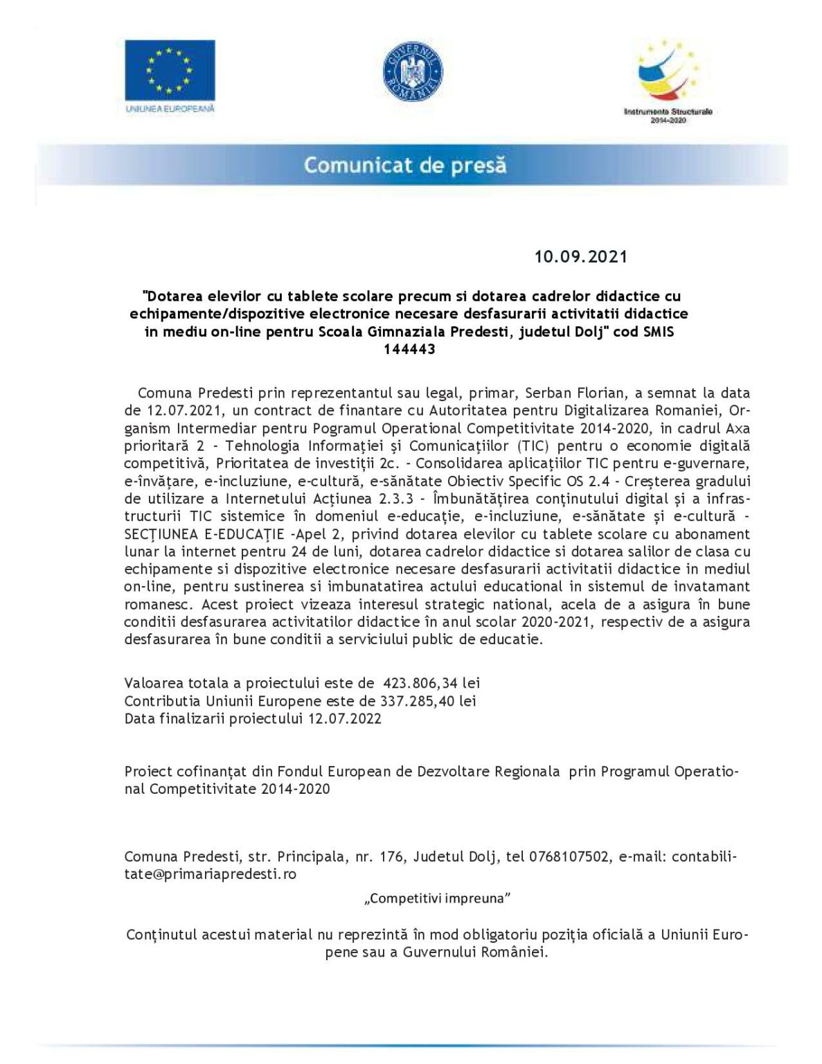 DoljEconomie„Dotarea elevilor cu tablete scolare precum si dotarea cadrelor didactice cu echipamente/dispozitive electronice necesare desfasurarii activitatii didactice in mediu on-line pentru Scoala Gimnaziala Predesti, judetul Dolj” cod SMIS 144443 Jurnalul Olteniei 13 septembrie 2021 Share SHARE Jurnalul Olteniei See Full Bio Distribuie acest articol Facebook Whatsapp Whatsapp Email Copy Link Print Articolul precedent Doi doljeni, arestați fiindcă au obligat două tinere să se prostitueze! Articolul următor Florin Cîțu, susținut de PNL Dolj la șefia partidului Ultima ora Se știe grupa în care poate juca România la Cupa Mondială din 2026 5 decembrie 2025 Dolj: Ajutoare sociale de peste 76 milioane lei 5 decembrie 2025 Cea de-a VII-a ediție a Semimaratonului Craiovei a avut loc sâmbătă, 18 octombrie 2025. 5 decembrie 2025 ANUNT PRIVIND ORGANIZAREA ACHIZITIEI DE UTILAJE . MINIEXCAVATOR – LOTUL 1, UTILAJ DE FORAT HIDRAULIC – LOTUL 2 – RELUATÃ 2 5 decembrie 2025 Modernizarea CF Filiași: Începe proiectarea 5 decembrie 2025 Testare gratuită HPV la Spitalul Județean Târgu Jiu 5 decembrie 2025 CE Oltenia raportează emisii scăzute de dioxid de carbon 5 decembrie 2025 DIICOT a destructurat un grup de proxenetism în Mehedinți 5 decembrie 2025 Legea pensiilor magistraților, atacată, din nou, la CCR 5 decembrie 2025 Magia Crăciunului Târgu Jiu: Seară de neuitat 5 decembrie 2025