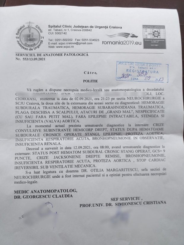 Update: La Spitalul Clinic Județean de Urgență Craiova a fost demarată o anchetă internă, după incidentul cu pacientul declarat mort de către cadrele medicale, deși acesta era în viață.