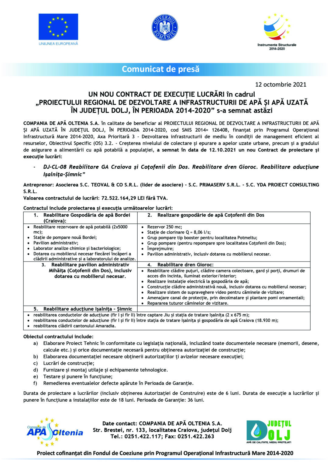 DoljEconomieOlteniaUn nou contract de execuție lucrări în cadrul „Proiectului regional de dezvoltare a infrastructurii de apă și apă uzată în județul Dolj, în perioada 2014-2020” s-a semnat astăzi Jurnalul Olteniei 11 octombrie 2021 Share SHARE Jurnalul Olteniei See Full Bio TAGGED:apaapa uzatacontractdezvoltareexecutie lucrariinfrastructuraproiect regional Distribuie acest articol Facebook Whatsapp Whatsapp Email Copy Link Print Articolul precedent 42 de angajați ai SJU Târgu-Jiu s-au vaccinat la începutul săptămânii Articolul următor Orban îşi depune miercuri demisia din funcţia de preşedinte al Camerei Deputaţilor Ultima ora Gorj: agresori reținuți și monitorizați electronic 5 decembrie 2025 Suspect de tentativă de agresiune reținut de Poliția Dolj 5 decembrie 2025 Locuință din Gorj cuprinsă de flăcări 5 decembrie 2025 Distribuție Oltenia: Oltenii, mai interesați de energie și sustenabilitate 5 decembrie 2025 Semimaratonul Craiovei 2025: Record de participanți 5 decembrie 2025 Sancțiuni de peste 40.000 lei și o activitate suspendată la Băbeni 5 decembrie 2025 Oltenia, sub cod galben de vânt. Avertizare ANM 5 decembrie 2025 Lansare proiect: „Împădurirea unui teren agricol în comuna Dobrești, beneficiar SEINEA ILEANA-MIHAELA „ 5 decembrie 2025 Flăcări în toiul nopții la Berislăvești! Pompierii vâlceni au salvat locuința cuprinsă de incendiu 5 decembrie 2025 Un fost jucător de la Universitatea Craiova, inclus în echipa lunii noiembrie, în Liga 2 5 decembrie 2025