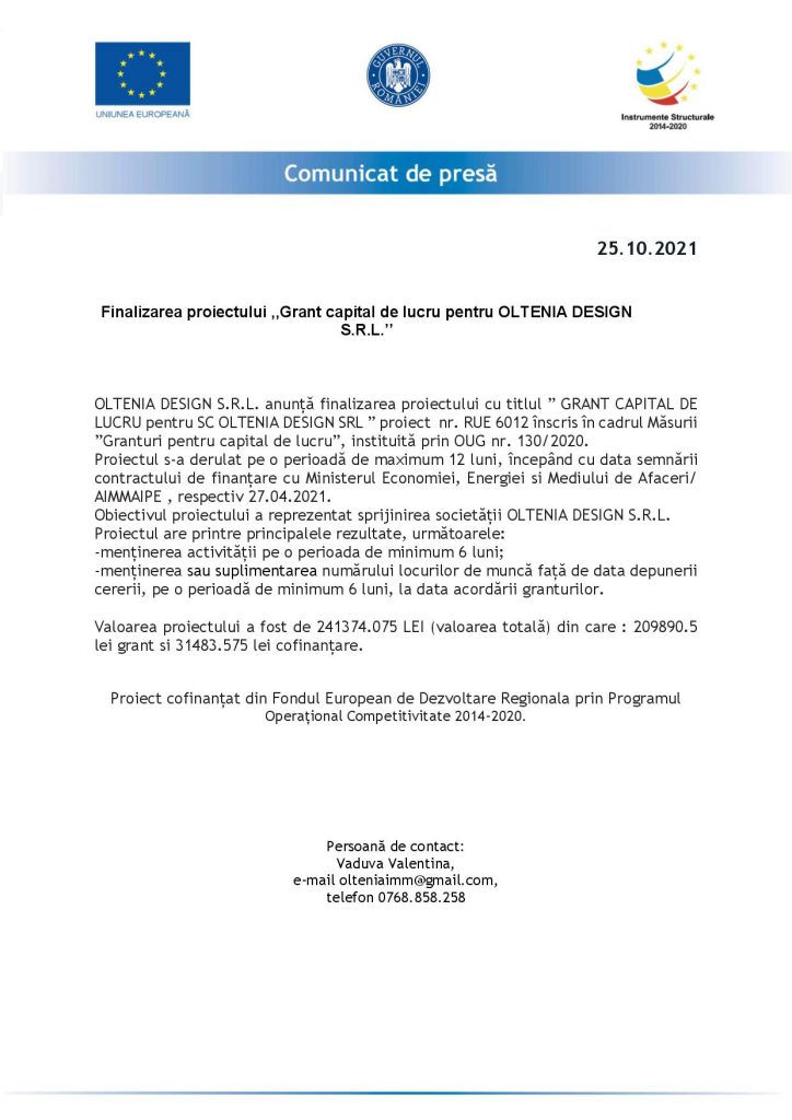 EconomieFinalizarea proiectului ,,Grant capital de lucru pentru OLTENIA DESIGN S.R.L.’’ Jurnalul Olteniei 4 ianuarie 2022 Share SHARE Jurnalul Olteniei See Full Bio Distribuie acest articol Facebook Whatsapp Whatsapp Email Copy Link Print Articolul precedent SJU Târgu Jiu nu mai are paturi libere la Terapie Intensivă Articolul următor La Primărie și fără certificat verde. Cine poate? Ultima ora Scandal în Gorj: Doi tineri reținuți după o bătaie 6 decembrie 2025 Sfântul Nicolae: 800.000 de români sărbătoriți pe 6 decembrie 6 decembrie 2025 Zilele Colindului în România: Tradiția care unește țara 6 decembrie 2025 Se știe grupa în care poate juca România la Cupa Mondială din 2026 5 decembrie 2025 Dolj: Ajutoare sociale de peste 76 milioane lei 5 decembrie 2025 Cea de-a VII-a ediție a Semimaratonului Craiovei a avut loc sâmbătă, 18 octombrie 2025. 5 decembrie 2025 ANUNT PRIVIND ORGANIZAREA ACHIZITIEI DE UTILAJE . MINIEXCAVATOR – LOTUL 1, UTILAJ DE FORAT HIDRAULIC – LOTUL 2 – RELUATÃ 2 5 decembrie 2025 Modernizarea CF Filiași: Începe proiectarea 5 decembrie 2025 Testare gratuită HPV la Spitalul Județean Târgu Jiu 5 decembrie 2025 CE Oltenia raportează emisii scăzute de dioxid de carbon 5 decembrie 2025