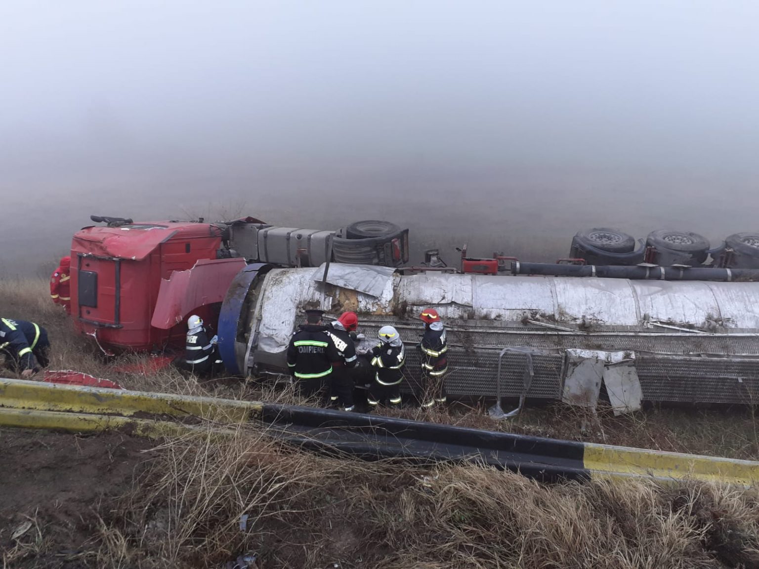 Evenimentul rutier a avut loc miercuri dimineață în jurul orei 6, când o autocisternă, în care se afla doar șoferul, s-a răsturnat în afara părții carosabile. Șoferul, un cetățean bulgar a fost transportat la spitalul din Caracal pentru îngrijiri medicale.