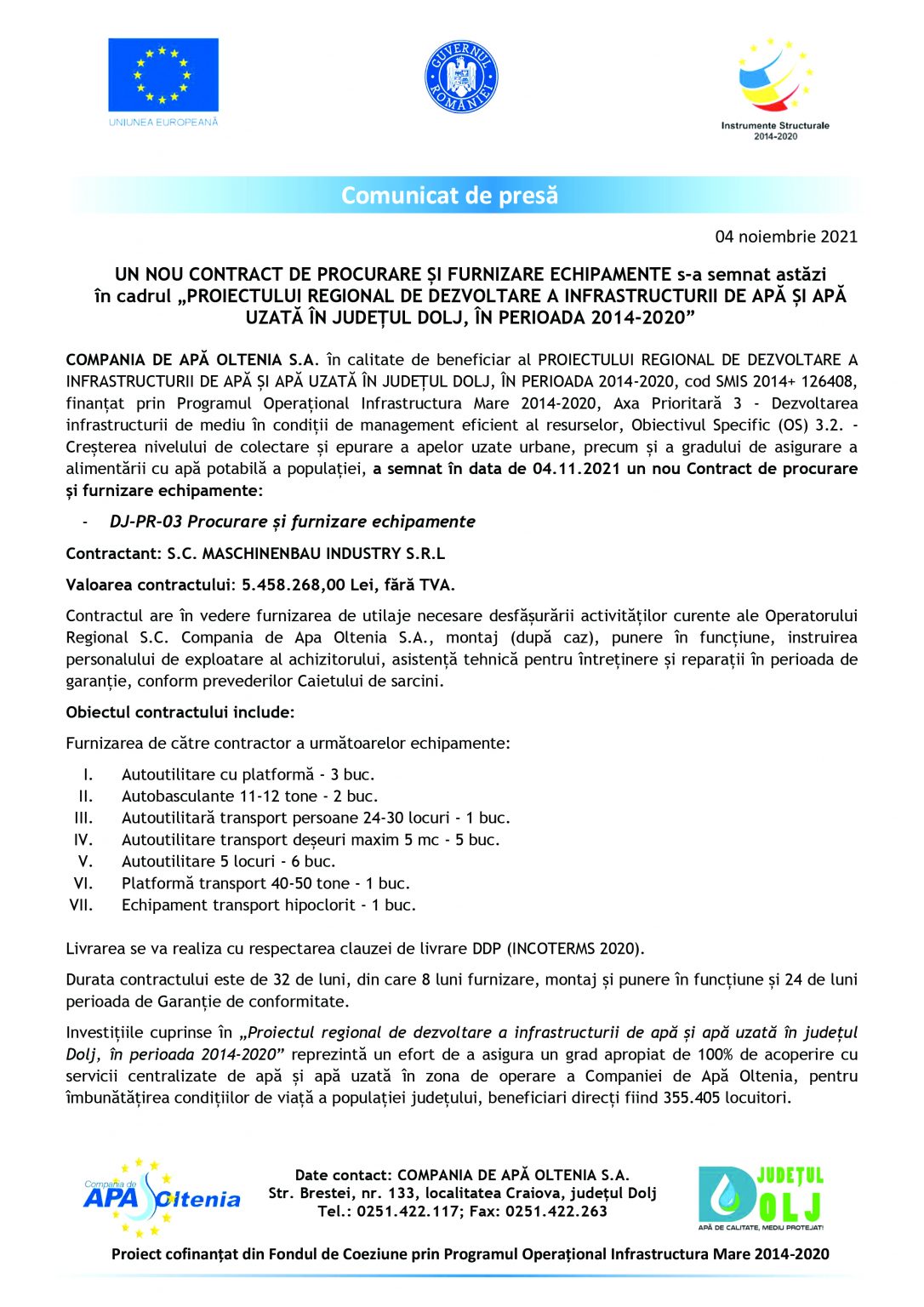ActualitateEconomieUn nou contract de procurare și furnizare echipamente s-a semnat astăzi în cadrul „Proiectului regional de dezvoltare a infrastructurii de apă și apă uzată în județul Dolj, în perioada 2014-2020” Jurnalul Olteniei 4 noiembrie 2021 Share SHARE Jurnalul Olteniei See Full Bio TAGGED:apă uzatăcontractdezvoltareechipamentefurnizareinfrastructurăprocurareproiect regional Distribuie acest articol Facebook Whatsapp Whatsapp Email Copy Link Print Articolul precedent Dolj. Peste 1400 de fermieri s-au înscris în Programul de legume în spații protejate Articolul următor Covid-19. Număr mare de morți, în Dolj! Incidența sare de 14/1000 într-o localitate Ultima ora Gorj: agresori reținuți și monitorizați electronic 5 decembrie 2025 Suspect de tentativă de agresiune reținut de Poliția Dolj 5 decembrie 2025 Locuință din Gorj cuprinsă de flăcări 5 decembrie 2025 Distribuție Oltenia: Oltenii, mai interesați de energie și sustenabilitate 5 decembrie 2025 Semimaratonul Craiovei 2025: Record de participanți 5 decembrie 2025 Sancțiuni de peste 40.000 lei și o activitate suspendată la Băbeni 5 decembrie 2025 Oltenia, sub cod galben de vânt. Avertizare ANM 5 decembrie 2025 Lansare proiect: „Împădurirea unui teren agricol în comuna Dobrești, beneficiar SEINEA ILEANA-MIHAELA „ 5 decembrie 2025 Flăcări în toiul nopții la Berislăvești! Pompierii vâlceni au salvat locuința cuprinsă de incendiu 5 decembrie 2025 Un fost jucător de la Universitatea Craiova, inclus în echipa lunii noiembrie, în Liga 2 5 decembrie 2025