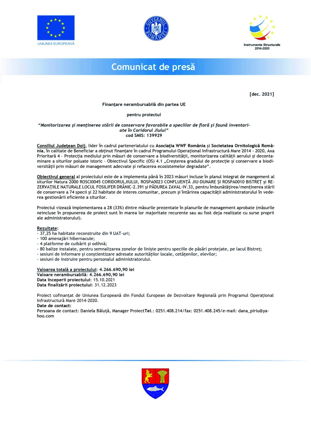 EconomieFinanțare nerambursabilă din partea UE pentru proiectul „Monitorizarea și menținerea stării de conservare favorabile a speciilor de floră și faună inventariate în Coridorul Jiului”. cod SMIS: 139929 Jurnalul Olteniei 22 decembrie 2021 Share SHARE 3 Jurnalul Olteniei See Full Bio TAGGED:conservarecoridorul jiuluifaunafinantareflorainventarmentineremonitorizarenerambursabilaproiectspeciiUE Distribuie acest articol Facebook Whatsapp Whatsapp Email Copy Link Print Articolul precedent Eurodeputații BECA solicită o acțiune mai puternică a UE împotriva cancerului Articolul următor O doctoriță și un infirmier, anchetați la Spitalul Județean de Urgență Târgu Jiu Ultima ora Sancțiuni de peste 40.000 lei și o activitate suspendată la Băbeni 5 decembrie 2025 Oltenia, sub cod galben de vânt. Avertizare ANM 5 decembrie 2025 Lansare proiect: „Împădurirea unui teren agricol în comuna Dobrești, beneficiar SEINEA ILEANA-MIHAELA „ 5 decembrie 2025 Flăcări în toiul nopții la Berislăvești! Pompierii vâlceni au salvat locuința cuprinsă de incendiu 5 decembrie 2025 Un fost jucător de la Universitatea Craiova, inclus în echipa lunii noiembrie, în Liga 2 5 decembrie 2025 Rusia blochează platforma de jocuri online Roblox 5 decembrie 2025 Cupa României: clasamentul și rezultatele din grupe 5 decembrie 2025 Cloud Dancer – Culoarea anului 2026 aleasă de Pantone 5 decembrie 2025 Râmnicu Vâlcea deschide sezonul sărbătorilor cu o seară specială de Ajunul lui Moș Nicolae 4 decembrie 2025 Ecranele, „cadoul otrăvit” pentru copii de sărbători 5 decembrie 2025