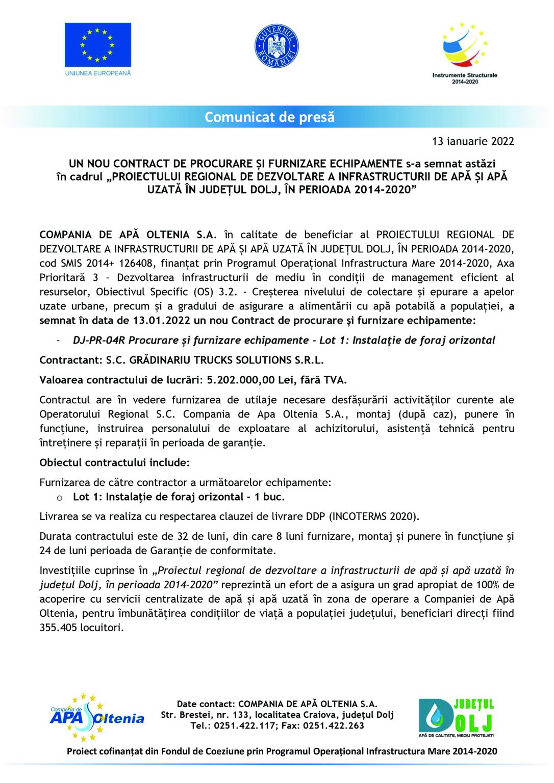 EconomieUn nou contract de procurare și furnizare echipamente s-a semnat astăzi în cadrul „Proiectului regional de dezvoltare a infrastructurii de apă și apă uzată în județul Dolj, în perioada 2014-2020” Jurnalul Olteniei 13 ianuarie 2022 Share SHARE Jurnalul Olteniei See Full Bio TAGGED:apaapa uzatacontractdezvoltareechipamentefurnizareinfrastructuraprocurareproiect Distribuie acest articol Facebook Whatsapp Whatsapp Email Copy Link Print Articolul precedent Legea privind introducerea de cursuri de conducere defensivă pentru cei cu carnetul de conducere suspendat, promulgată Articolul următor Ministrul Energiei vrea ca 50% din preţul gazelor să fie compensat din bugetul de stat Ultima ora Gorj: agresori reținuți și monitorizați electronic 5 decembrie 2025 Suspect de tentativă de agresiune reținut de Poliția Dolj 5 decembrie 2025 Locuință din Gorj cuprinsă de flăcări 5 decembrie 2025 Distribuție Oltenia: Oltenii, mai interesați de energie și sustenabilitate 5 decembrie 2025 Semimaratonul Craiovei 2025: Record de participanți 5 decembrie 2025 Sancțiuni de peste 40.000 lei și o activitate suspendată la Băbeni 5 decembrie 2025 Oltenia, sub cod galben de vânt. Avertizare ANM 5 decembrie 2025 Lansare proiect: „Împădurirea unui teren agricol în comuna Dobrești, beneficiar SEINEA ILEANA-MIHAELA „ 5 decembrie 2025 Flăcări în toiul nopții la Berislăvești! Pompierii vâlceni au salvat locuința cuprinsă de incendiu 5 decembrie 2025 Un fost jucător de la Universitatea Craiova, inclus în echipa lunii noiembrie, în Liga 2 5 decembrie 2025