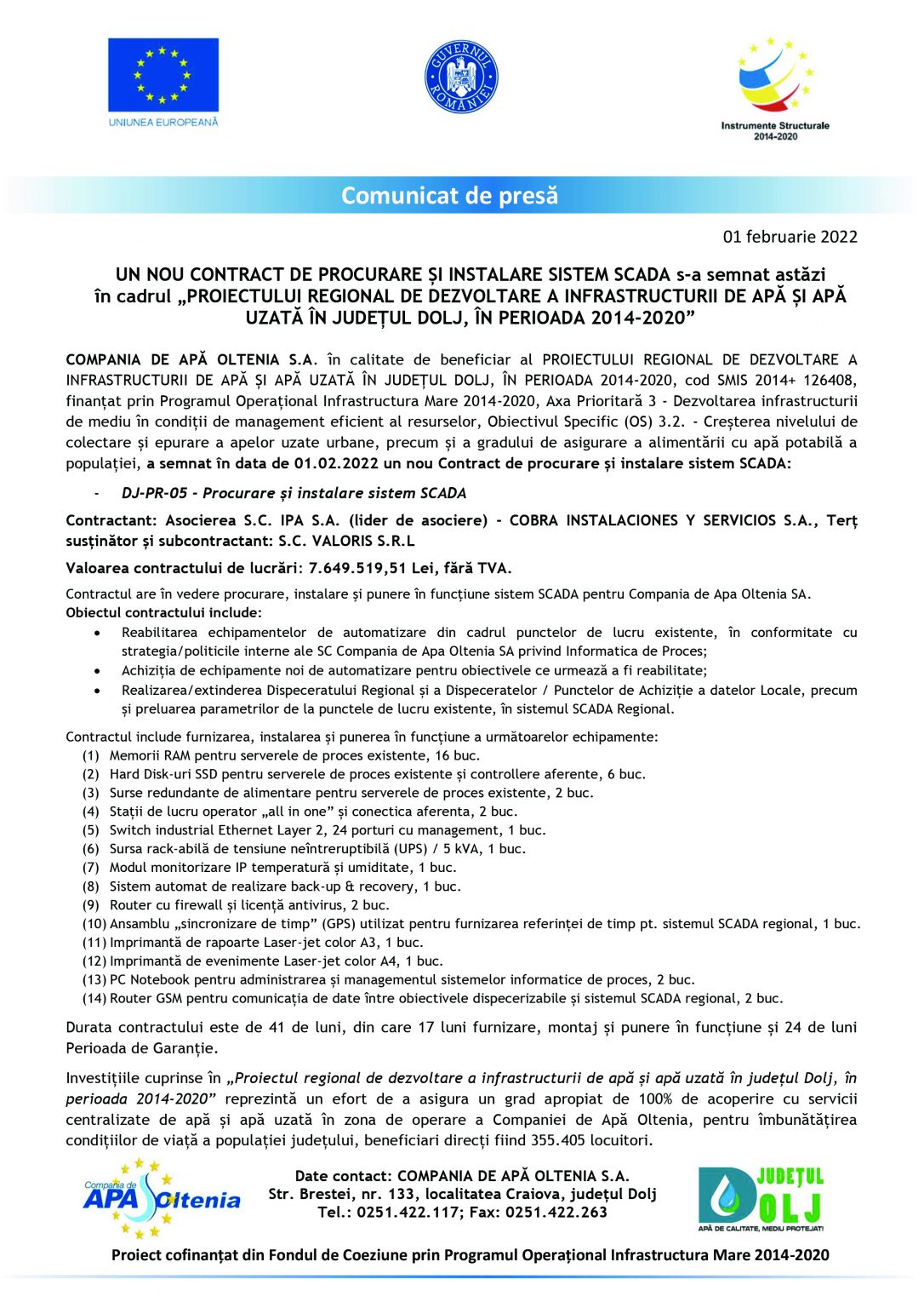 EconomieUn nou contract de procurare și instalare sistem SCADA s-a semnat astăzi în cadrul „Proiectului regional de dezvoltare a infrastructurii de apă și apă uzată în județul Dolj, în perioada 2014-2020” Jurnalul Olteniei 1 februarie 2022 Share SHARE Jurnalul Olteniei See Full Bio TAGGED:apaapa uzatacontractdezvoltareinfrastructurainstalareprocurareproiect regionalSCADAsistem Distribuie acest articol Facebook Whatsapp Whatsapp Email Copy Link Print Articolul precedent Angajații ALRO, din nou în stradă Articolul următor Ministerul Sănătății: Certificatul verde cu 2 doze de vaccin e încă valabil la intrarea în țară Ultima ora Magia Crăciunului Târgu Jiu: Seară de neuitat 5 decembrie 2025 A dat bancnote false cu „Prop Copy”: Percheziții în Mehedinți 5 decembrie 2025 Căprioare și ponei, de Crăciun, în Parcul Romanescu 5 decembrie 2025 Gorj: agresori reținuți și monitorizați electronic 5 decembrie 2025 Suspect de tentativă de agresiune reținut de Poliția Dolj 5 decembrie 2025 Locuință din Gorj cuprinsă de flăcări 5 decembrie 2025 Distribuție Oltenia: Oltenii, mai interesați de energie și sustenabilitate 5 decembrie 2025 Semimaratonul Craiovei 2025: Record de participanți 5 decembrie 2025 Sancțiuni de peste 40.000 lei și o activitate suspendată la Băbeni 5 decembrie 2025 Oltenia, sub cod galben de vânt. Avertizare ANM 5 decembrie 2025