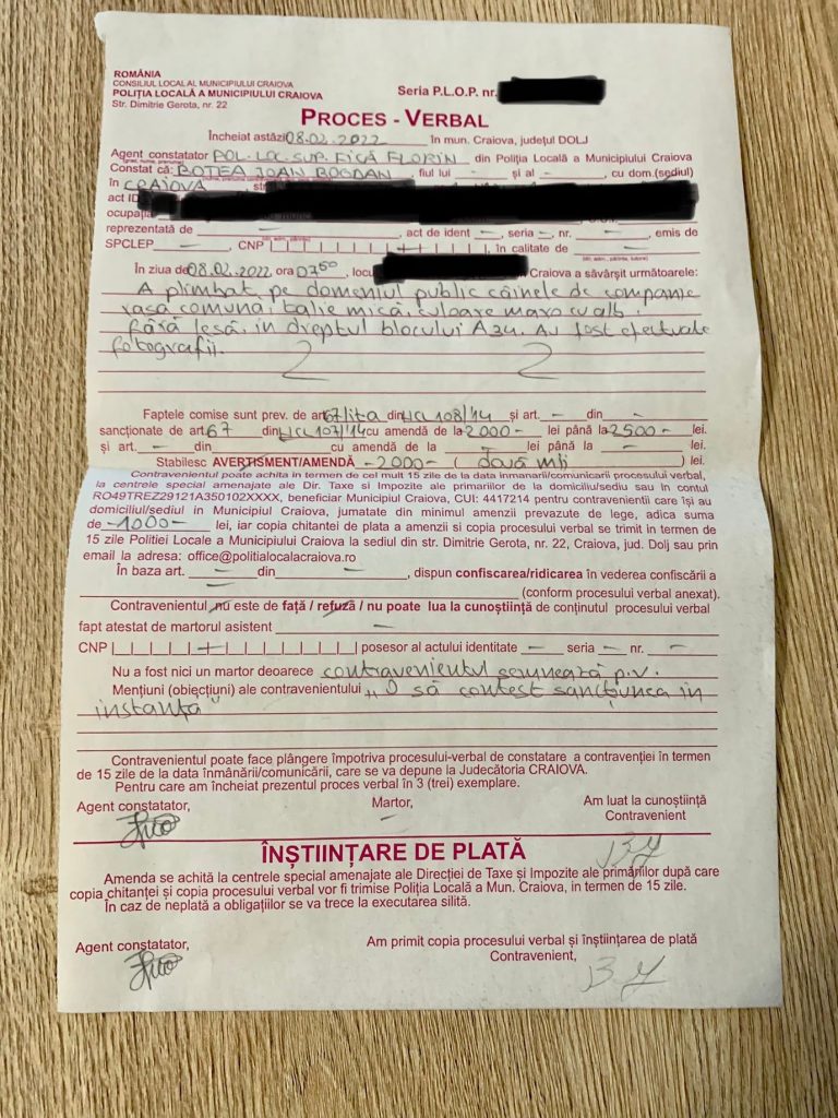 Cu masina in statia de autobuz, pe avarii si chititi pe treaba, ca doar era ora 7 dimineata, se dau jos 4 angajati ai politiei locale (numele lor fiind si in postare) si ma striga sa vin la ei. Eu crezand ca sunt cumva martor la vreun eveniment cu urmariri de masini, furturi sau alte cazuri grele m-am dus ca sa ajut. Din cei 4 politisti de langa mine unul intreaba: – Stiti ce ati facut?Eu mirat dau din umeri…- Saptamana trecuta s-a dat o lege care a fost anuntata pe Facebook ca sa nu mai fie caini agresivi fara lesa pe domeniul public si o sa va dam amenda.Eu ma uitam la Otto si nu intelegeam daca este campanie de informare sau chiar vorbesc serios. – Pungi aveti?Arat sacii menajeri – Fa-i poza la pungi sa avem (zice altul)- Da, aveti pungi, tineti mana intinsa sa le fac o poza. Haideti la masina sa dati datele.Am crezut initial ca voi primii o avertizare scrisa ca sa ramana in sistem. Daca pana acum nu au vorbit toti, ei bine la masina am avut de-a face cu „seful” gastii care mi-a zis scurt: – Amenda de 500 lei in 15 zile pentru ca nu e in lesa.- Este in tarc, tarcul inchis, este un pechinez… nu un rotwailer. O lege data de o saptamana se merge mai intai pe preventie, nu pe contraventie. Uitandu-se lung la mine imi zice:- Nu discut. Vino la sectie intr-o jumatate de ora sa semnezi amenda ca altfel ti-o trimit prin posta. – Nu inteleg de ce ma amendati pentru o lege anuntata pe Facebook. Trebuia anuntat la asociatie, la scarile blocului puse afise si alte forme de instiintare, pentru ca nu toata lumea are Facebook sau timp de Facebook.- Nu intelegi ca nu discut, vii la sectie sau iti trimit amenda prin posta.Las bestia acasa si ma duc la sectia de politie, care e la mine pe strada. Ajuns acolo incerc sa le explic, rational, fara injurii, ca Otto nu e caine periculos si ca macar sa imi schimbe amenda in avertisment si voi fi mai atent pe viitor. Amenda de 500 lei mi se pare ridicola in situatia asta. Rolul politiei ar trebui sa fie proventia nu contraventia, dar degeaba discutam. – Va inteleg, spune unul dintre ei, am si eu caine si sunt de acord cu dumneavoastra, dar asta e legea e lege. 500 lei amenda.- Asteptati afara (adica in afara sediului de politie, in frig) pana cand va scriem amenda.Practic am fost invitat afara pentru ca incercam sa rationez cu ei. Am asteptat pe holul sectiei, ca doar nu era sa stau in frig, si exasperat de mentalitatea oamenilor cu care am intrat in contact sunt chemat inauntru unde aflu ca amenda s-a marit la 2.000 lei si replica a fost pe masura: – Am facut o greseala, am completat gresit procesul verbal si am trecut 2.000 lei.- Pai si nu il modificati?- Nu se poate modifica, ce crezi ca aici ne batem joc de acte. – Pai si ce ati trecut acum in procesul verbal?- Hai vino-ncoa sa iti arat. Vroiam sa iti dau ca nu ai avut pungi dar daca tot vrei avertisment lasa ca iti dau 2.000 lei cat e pentru lesa. Sa stii ca daca nu aveai pungile la tine primeai 3.000 lei amenda cumulat.Uitandu-ma la ei mi-am dat seama ca am de-a face cu oameni rai, cu oameni care isi bat joc de cetateni si fac abuzuri doar pentru bunul plac.Am semnat procesul verbal si cu mentiunea ca voi contesta in instanta.Atasez poze cu tarcul din fata blocului meu, cu bestia mea Otto si cu amenda.Va sugerez sa vizitati profilele de Facebook ale domnilor politisti ca sa vedeti ce tip de oameni sunt angajati in sistem. Sper ca sunt multumiti si impacati cu deciziile lor si privesc cu mandrie meseria ce o practica.Mi se pare strigator la cer ca atunci cand ceri ajutorul politiei, nimeni nu apare, dar cand e de dat amenda unui stapan de caine fara lesa, unei babute ce vinde patrunjel si alte cazuri deosebit de grave 4 persoane se inghesuie care mai de care”, a scris tânărul, pe Facebook.
