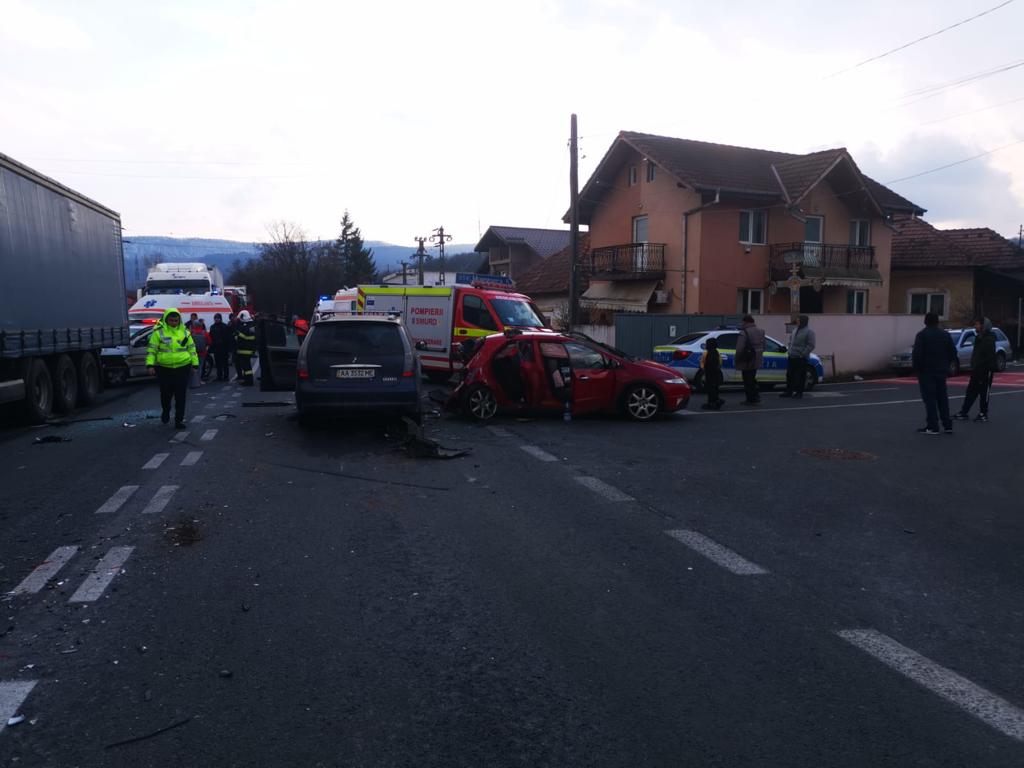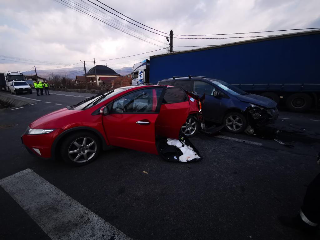 O femeie din Ucraina și alte șase pesoane din România, au fost rănite în urma unui accident rutier dintre două autoturisme și un autocamion, marți după-amiază pe DN7, în dreptul localităţii Bujoreni.